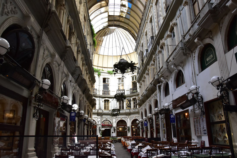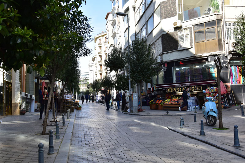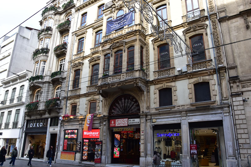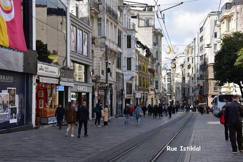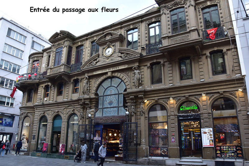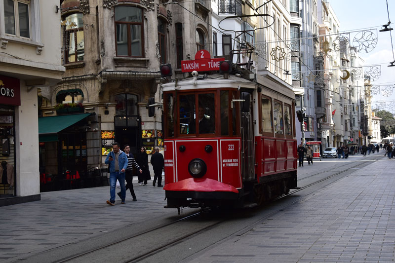 De la place Taksim, nous avons emprunté la longue artère piétonne et commerçante, la rue Istiklal. Elle est bordée d’élégantes façades du 19ème siècle et cache de jolis passages dont le plus connu est le passage aux fleurs. L’autre attraction de cette rue est le tramway de la belle époque, rouge et blanc, et toujours bondé de touristes !