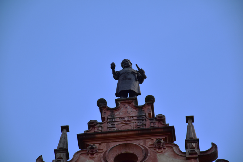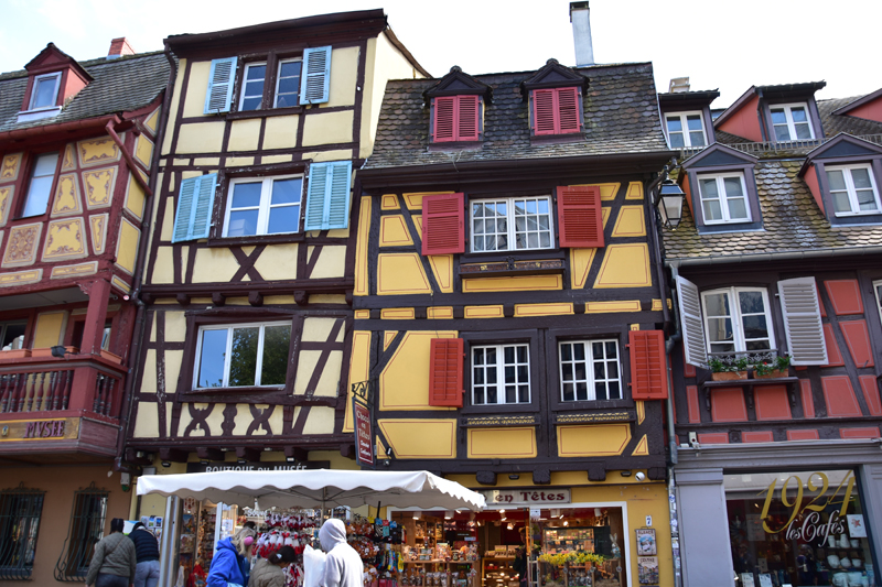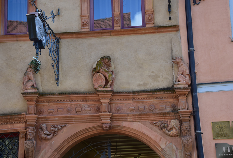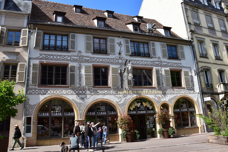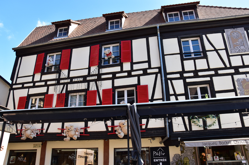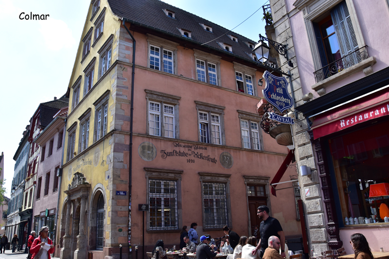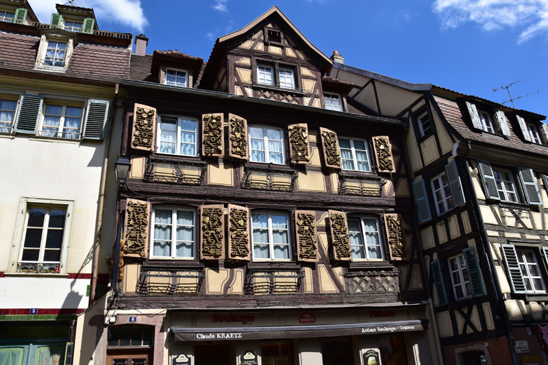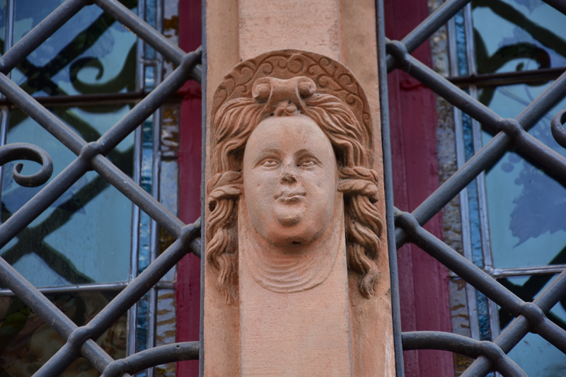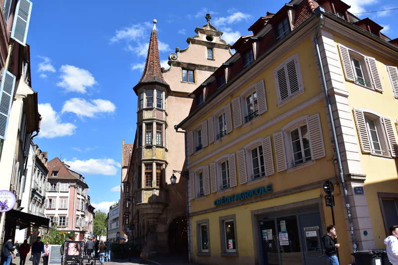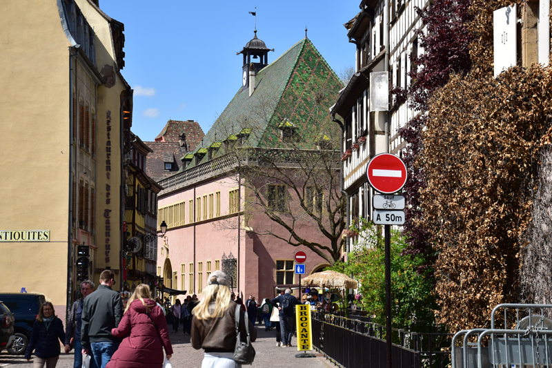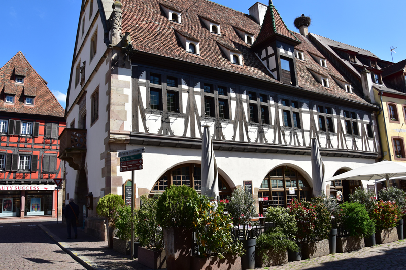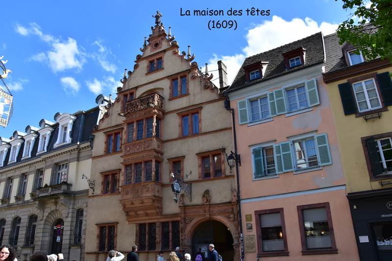 Enfin, avant de terminer cette belle balade, nous sommes passés devant un des incontournables de Colmar, la Maison des Têtes. Cette demeure bourgeoise édifiée en 1609 doit son nom à l’insolite décoration composée de 105 masques grotesques. Un tonnelier alsacien en bronze, oeuvre d’Auguste Bartholdi, couronne le superbe pignon chantourné. Il rappelle que ce bâtiment servit, jadis, de Bourse aux Vins…