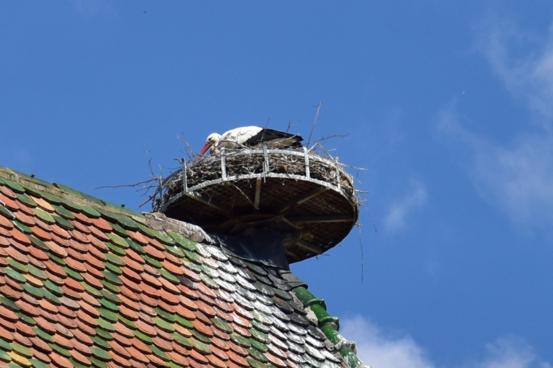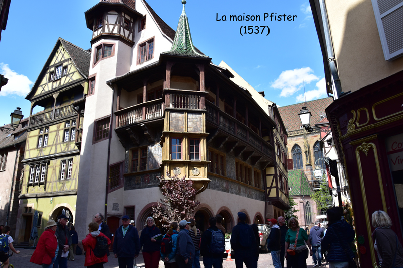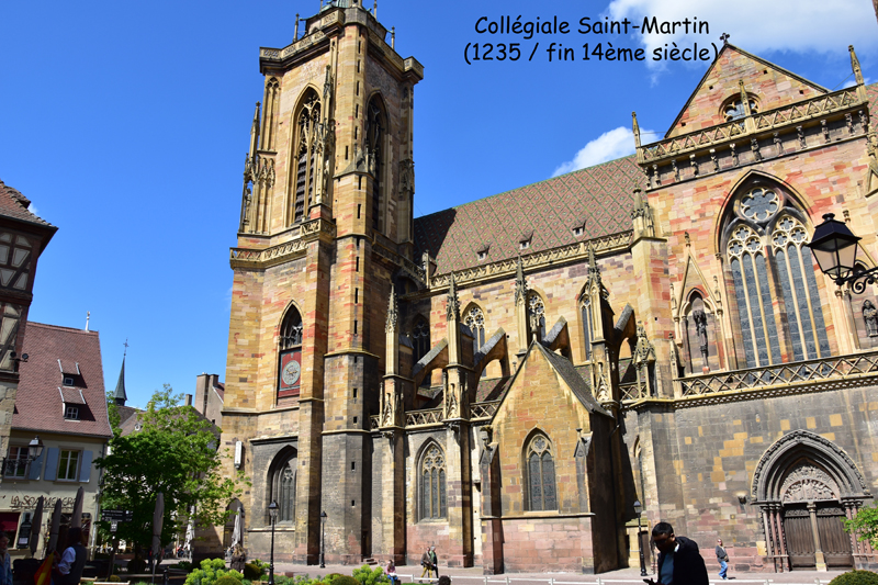 Nous avons ensuite emprunté la Grand’rue en passant devant le Tribunal de Grande Instance pour rejoindre le centre-ville et la Collégiale St Martin. Nous avons encore découvert une très jolie rue, très colorée, la rue des Marchands, avant d’arriver place de la Cathédrale, en passant devant la maison Pfister, demeure bourgeoise construite en 1537 par le chapelier Louis Scherer. La collégiale St Martin, élevée à partir de 1235 et achevée vers la fin du 14ème siècle, impose par ses dimensions de cathédrale. Des deux tours initialement prévues, seule la tour Sud fut achevée. Sur son toit, nous avons eu la surprise de voir à nouveau une cigogne dans son nid ! Et ce n’est pas tout, puisque nous avons aussi pu observer un faucon crécerelle… quel bonheur !
