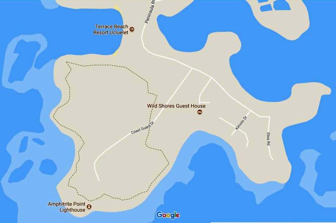 C’est un trail de 3kms environ qui part du bout de la pointe d’Ucluelet et qui est matérialisé en pointillés sur la capture d’écran ci-dessous…