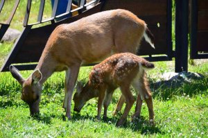 Du coup, nous avons poussé jusqu’à Port Albion, minuscule village peuplé, nous a-t-il semblé, uniquement d’amérindiens, et qui se trouve juste en face d’Ucluelet. Au retour, nous nous dirigions vers la supérette pour nous acheter notre repas de ce soir quand nous avons vu, comme l’autre jour, débouler toute une famille de biches : le papa avec ses petites cornes, la maman et les deux adorables faons. Cette fois, on s’est arrêté et j’ai pu faire de jolies photos.