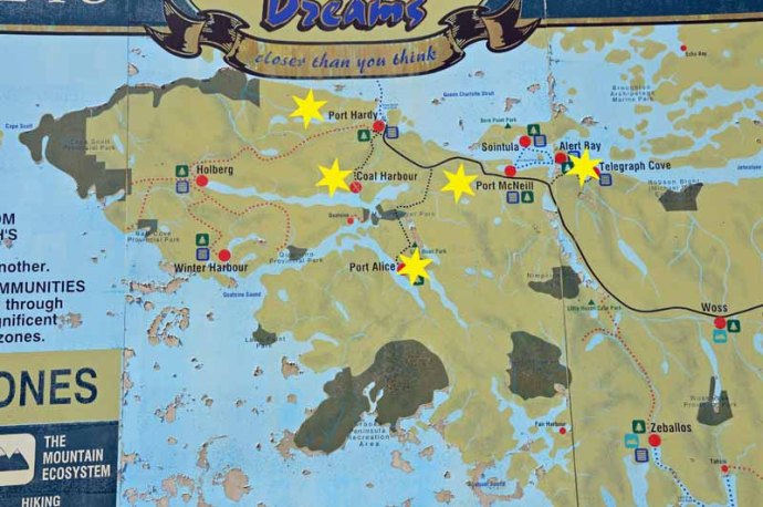 Etant donné l’absence des baleines et des orques, ce qui est le principal attrait par ici, nous avons décidé d’aller visiter les petites villes du bout du monde, puisque partout où nous sommes allés aujourd’hui, nous étions au bout du bout de la route : Port Alice à une quarantaine de kms d’ici, Port Hardy à la même distance et Coal Harbor à une quinzaine de kms de Port Hardy. Hier déjà, en allant à Telegraph Cove, nous étions aussi en bout de route ! Nous aurons donc été partout dans le Nord de l’île où nous pouvions accéder en voiture…  J’ai matérialisé ces endroits par des étoiles jaunes ci-dessous.
