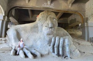 Après nous être gavés de cerises délicieuses, nous sommes partis à la rencontre du Troll, que je voulais absolument voir après avoir découvert cette drôle de chose dans mon guide (oui, celui que j’ai oublié à la maison !!!). Située dans le quartier de Fremont, sous le Fremont Bridge, la sculpture est le résultat d’un concours organisé par le Fremont Arts Council en 1989-1990[] afin de redynamiser la zone afin qu’elle ne soit pas utilisée par des dealers. Il s’agit d’un troll en béton armé de 5m50 de haut qui tient dans sa main une Volkswagen Coccinelle (épave véritable parait-il). Il y a toujours du monde autour et nous y avons même rencontré des français… Vous pourrez aussi constater qu’un homme aux cheveux verts prend une photo (depuis que nous sommes ici, Canada y compris, nous sommes effarés par le nombre de gens – hommes, femmes, vieux, jeunes – qui ont des cheveux de toutes les couleurs de l’arc-en-ciel ! Je vous en ai déjà montré plusieurs, si vous êtes attentifs…
