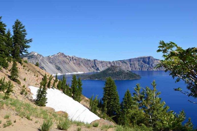 Le lac, d’une couleur bleu intense est le lac le plus profond des États-Unis avec ses 592m de profondeur. Il est le résultat de l’éruption du Mont Mazama il y a plus de 7000 ans, La chambre magmatique s’est vidée en rejetant la lave qu’elle contenait. Près de 50 km3 de matières sont ainsi éjectées hors du volcan, soit 75 fois plus que lors de l’éruption du mont Saint Helens en 1980. Le sommet du volcan a fini par s’effondrer sous son propre poids dans la chambre magmatique vidée. Par la suite, les précipitations importantes de la région ont rempli au fil des années le gouffre pour former le lac actuel. Quelques plus petites éruptions ont encore eu lieu par la suite avec, par exemple, la formation de l’île Wizard (le petit cône que vous verrez à l’intérieur du lac) mais La zone ne connaît plus de réelle activité volcanique depuis près de 5 000 ans. Toutefois, les géologues pensent que de nouvelles éruptions pourraient encore apparaître au niveau du lac. En cas d’éruption, le danger principal serait la rupture du barrage naturel constitué par les falaises entourant le lac, ce qui aurait pour conséquence la vidange brutale des eaux et qui créerait une sorte de raz de marée… mais pas de panique, ça ne s’est pas produit aujourd’hui et nous sommes plus que comblés par notre journée.
