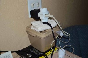 Quand nous arrivons à l’hôtel, le premier « boulot » de Pépère est de faire les branchements pour recharger tout notre matériel. Comme les prises ne sont pas toujours adéquats, je ne peux me priver du plaisir de vous montrer les installations abracadabrantes… mais c’est MacGyver qui opère, donc….