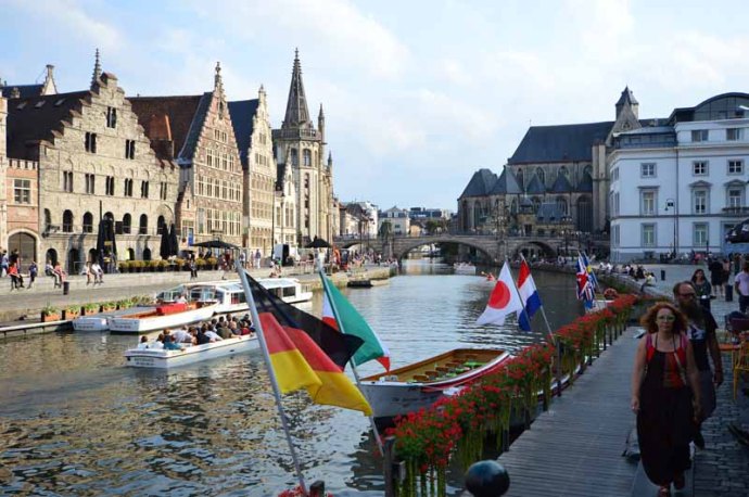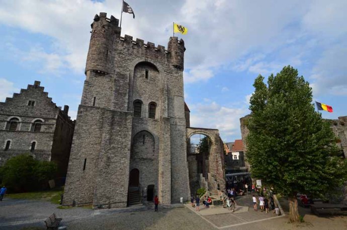 Notre première « mission » était de nous rendre à l’Office du Tourisme pour y chercher notre « Gand City Card », bon plan pour s’offrir tous les transports et visites sans compter… et nous l’avons bien amortie. De l’hôtel, 10mn de marche suffisait pour nous y rendre et nous nous sommes rendu compte que c’était la distance qui nous séparait du centre historique… Cool ! Munis de ce précieux sésame, nous avons pu commencer les découvertes et puisque nous étions tout à côté du château des Comtes de Flandre et que la porte était ouverte, nous sommes rentrés ! Mais bien sûr, nous avions déjà commencé à mitrailler durant le trajet. C’est ainsi que vous pourrez admirer quelques endroits qui nous ont bien mis en appétit ! L’ancienne poste, le Beffroi, les bords de la Lys (Gand est au confluent de la Lys et de l’Escaut) avec ses maisons typiques flamandes, l’imposant bâtiment de la grande boucherie datant de 1404, qui était l’unique point de vente autorisé de la viande…