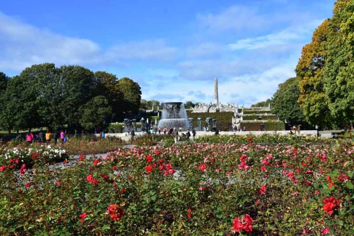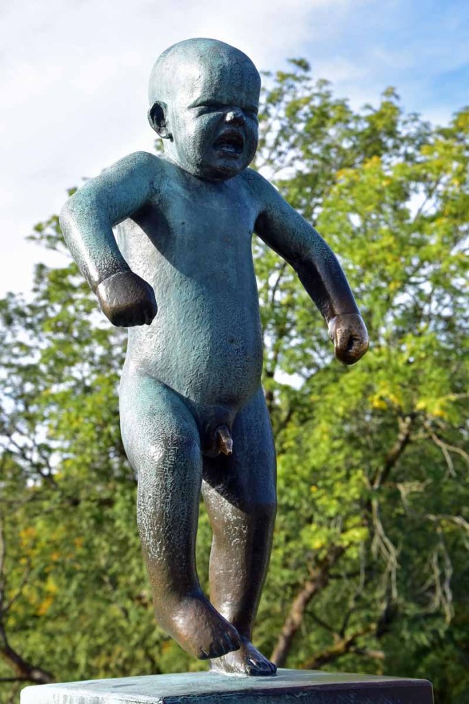 Nous avons commencé par un parc magnifique, le Vigeland, du nom de son créateur, Gustave Vigeland. Il passa 20 ans de sa vie à concevoir et à façonner ce fabuleux parc de statues géantes d’une grande sensibilité. 212 sculptures, figurent des hommes, des femmes et des enfants à tous les âges. L’une des 58 sculptures en bronze représente le propre fils de Vigeland qui explose littéralement de colère. Cette œuvre compte parmi les emblèmes de l’Art norvégien.  L’allée centrale mène jusqu’au monolithe composé de 121 figures enchevêtrées représentant les âges de la vie qui  luttent pour s’élever. Nous avons tous les trois adoré ce parc.