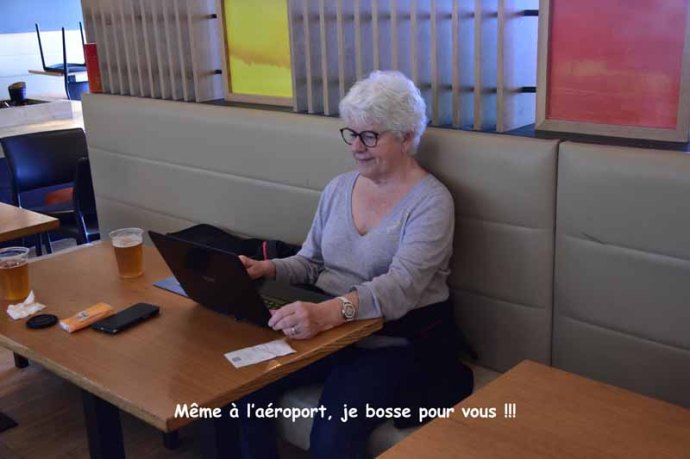 J’avais commencé à préparer le blog à l’aéroport (comme le prouve cette photo) car notre vol  était annoncé en retard (et il semblait avec pas mal de retard !). Finalement, nous avons décollé avec une trentaine de minutes de retard seulement ce qui fait que je n’ai pas eu le temps de boucler mon article. Il faut donc que je reprenne le fil de mes idées et que je mette au passé ce que j’avais écrit au présent… Gros exercice grammatical !!!