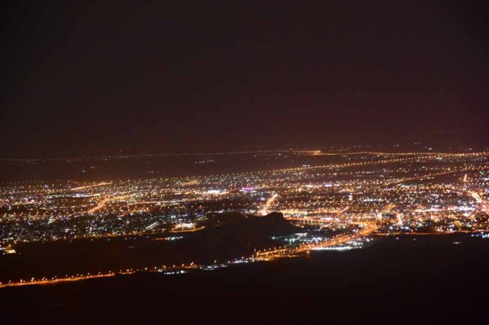 Donc, hier, nous étions encore à Al Aïn où, hélas, tout était bien fermé, même l’oasis… Comme promis, vous verrez Al Aïn depuis le haut du Jebel Hafeet, de nuit. Il est vrai que les lumières scintillent de tous leurs feux du côté Abu Dhabi (on voit bien que l’argent ne manque pas dans l’Emirat) mais côté Oman, c’est la nuit.