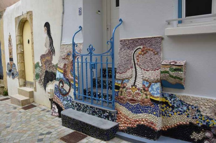 Du coup, nous avons poussé jusqu’aux Sables d’Olonne et là nous avons été charmés. Il y avait beaucoup de monde sur le port pour aller voir les bateaux de retour du Vendée-Globe, mais nous, nous avons pris la direction du centre ville pour aller visiter un quartier adorable, « l’île Penotte » qui n’a rien d’une île, mais qui est très original. A l’origine ce quartier, tout ce qui a de plus ordinaire, est devenu un musée en plein air grâce à une artiste sablaise Danièle Arnaud-Aubin. Elle n’avait qu’un seul objectif, redonner vie à son quartier d’enfance et commença à créer en 1997 des fresques de coquillage sur les murs avec l’accord des propriétaires et de la Mairie. Le résultat est superbe !