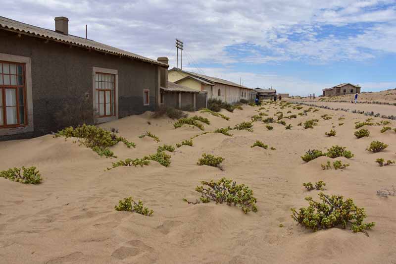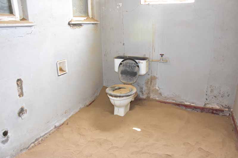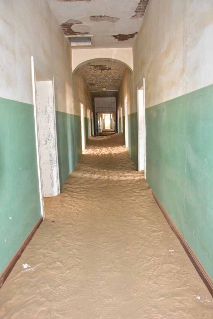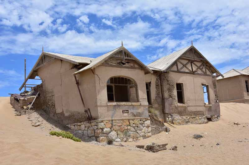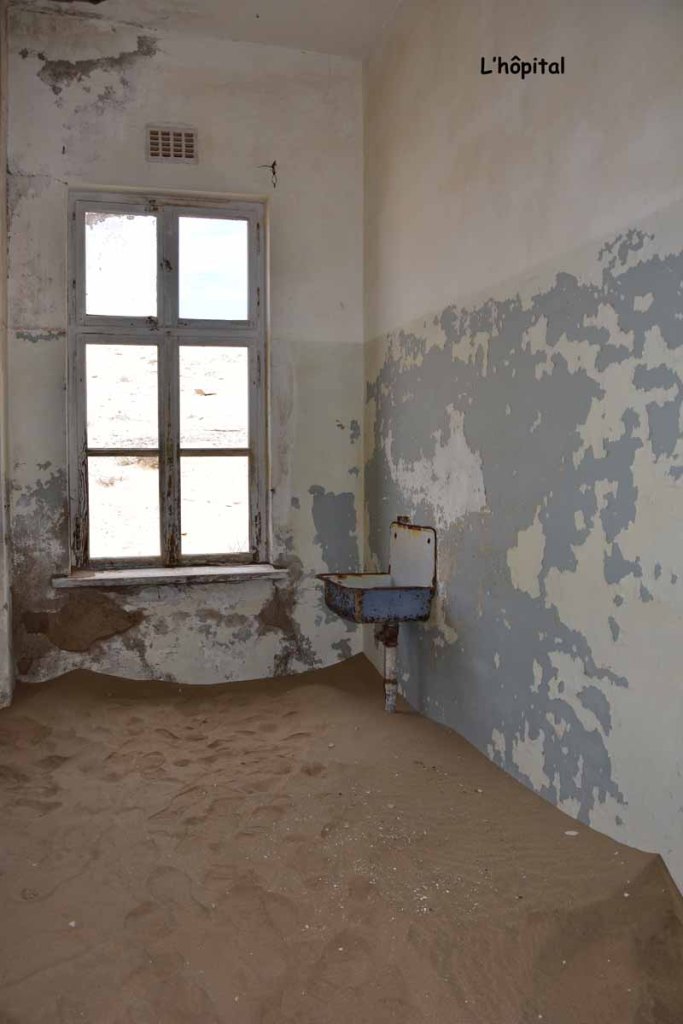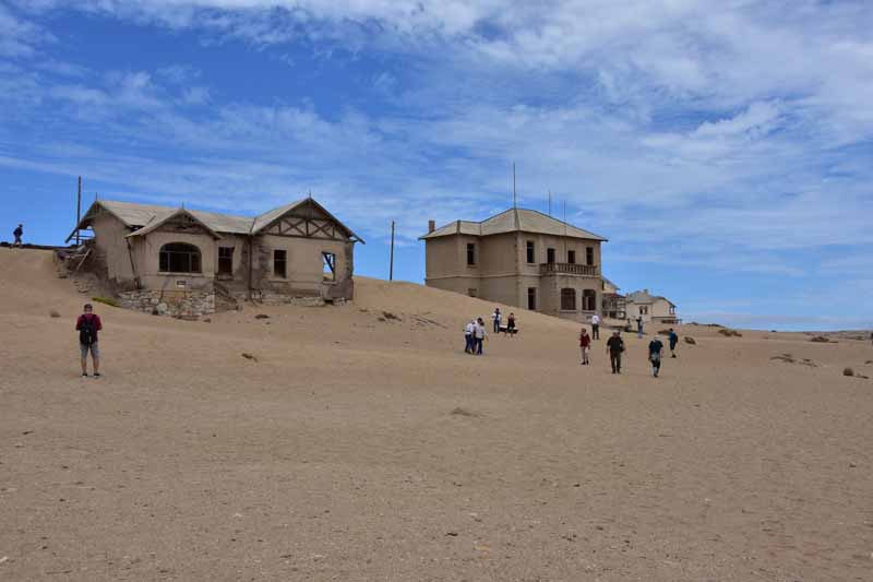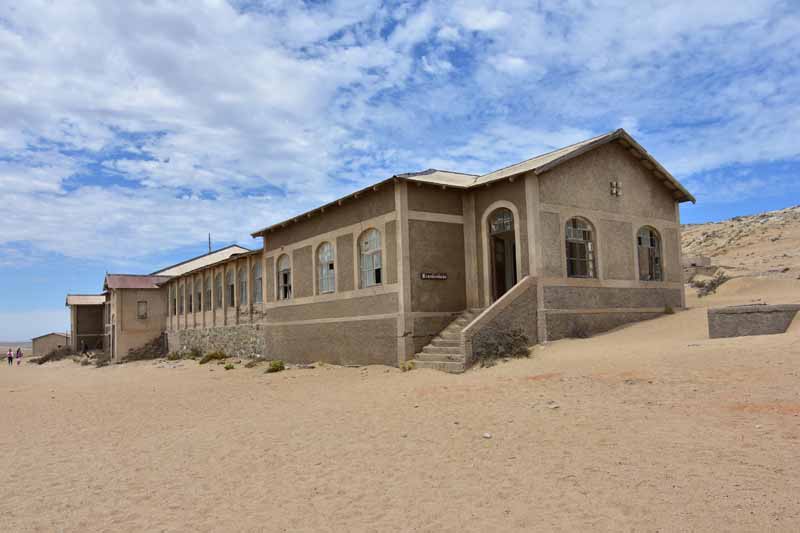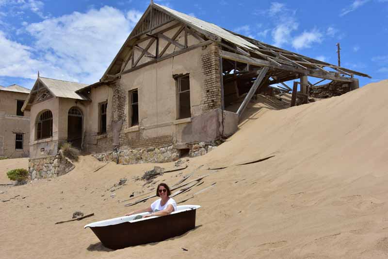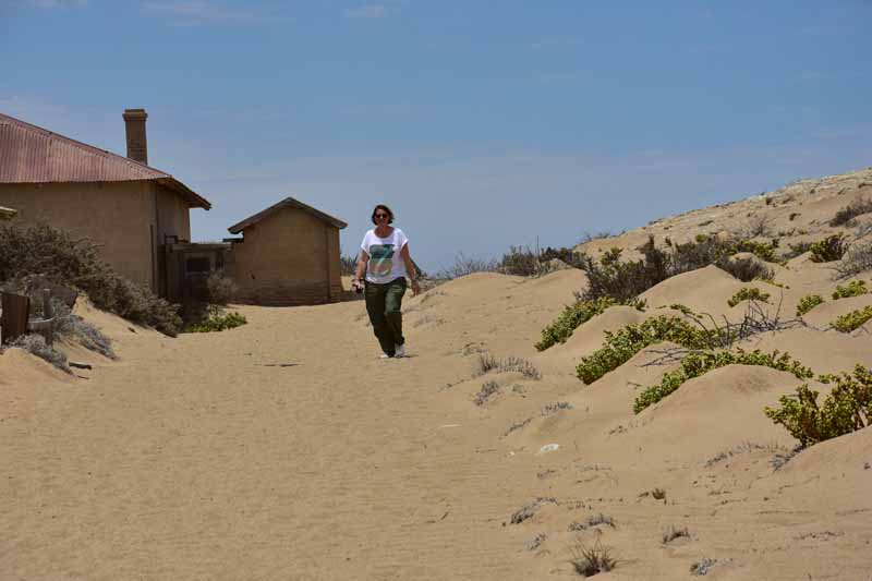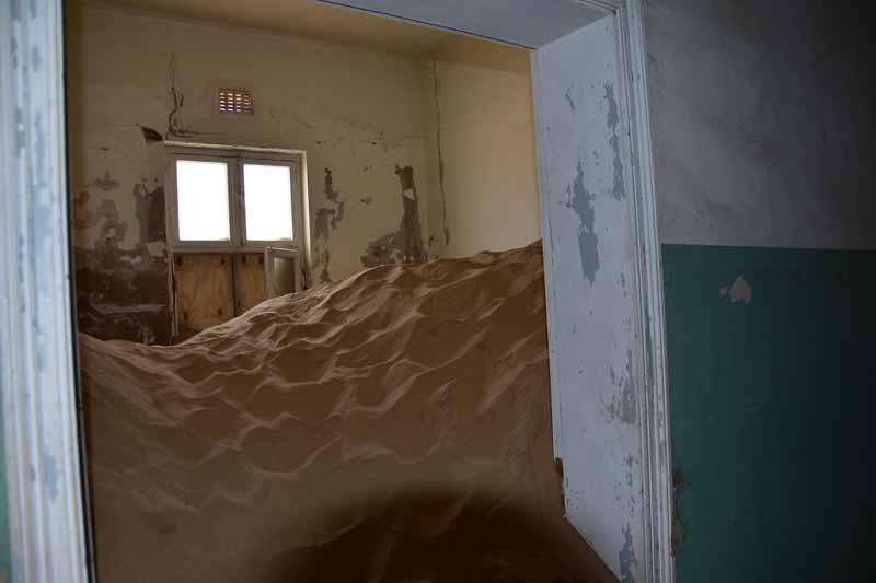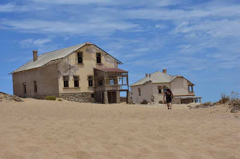 Nous sommes ensuite partis pour Kolmanskop. Ce village fantôme est totalement envahi par le sable du désert ce qui lui confère une atmosphère particulière. Kolmanskop fut construit en 1908 par les colons allemands, venus faire fortune dans les mines de diamant. La ville a atteint son apogée en 1920 mais petit à petit le déclin s’amorça. La ville fut totalement abandonnée en 1954. Seuls quelques mineurs travaillent aujourd’hui encore dans les mines de diamants. Nous avons eu la chance d’avoir un guide pour nous 3, cool !