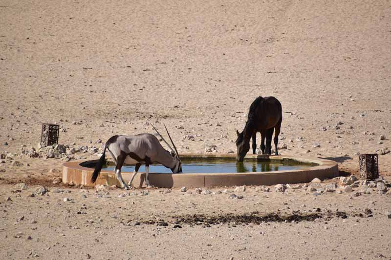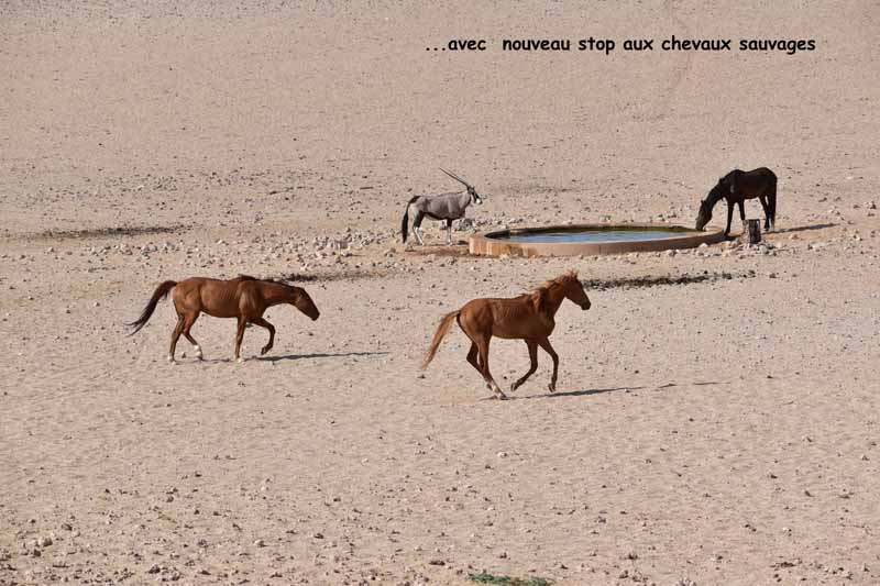 Sur la route de notre étape de ce soir, nous sommes repassés par le point d’eau de Garup et ses chevaux sauvages que nous avons eu la joie de retrouver, avec un oryx en prime. Nous sommes chanceux.