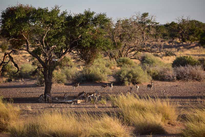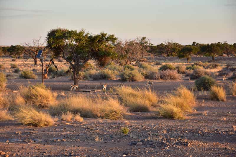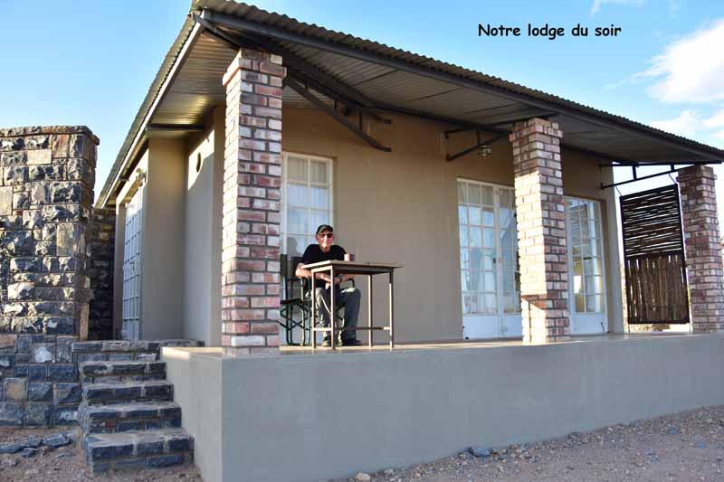 Nous avons eu une journée très remplie, merveilleuse, avec de belles découvertes… L’envers de la médaille c’est que nous sommes arrivés à notre lodge (en pleine brousse, ne me demandez pas le nom de l’endroit !) très tardivement. De plus, la vue et la luminosité de fin de journée étant exceptionnelle, nous n’avons pas pu résister à un petit apéritif devant des springboks venus s’abreuver devant notre terrasse ! Evidemment, dans ces conditions, le blog en pâtit un peu !
