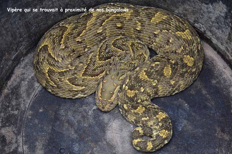 En rentrant du safari du matin, le ranger qui s’occupe du camp nous a montré une vipère qu’il avait ramassée près des bungalows… Elle était au fond d’un seau avant qu’il n’aille lui rendre sa liberté un peu plus loin (ouf !).