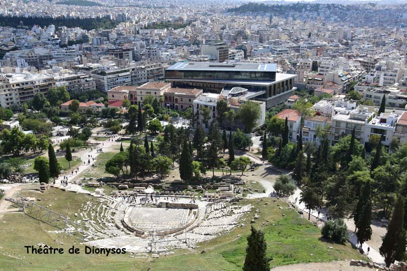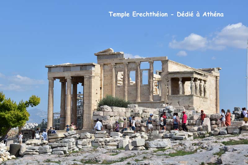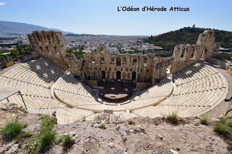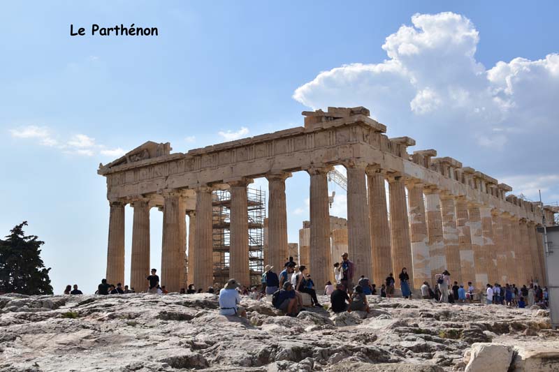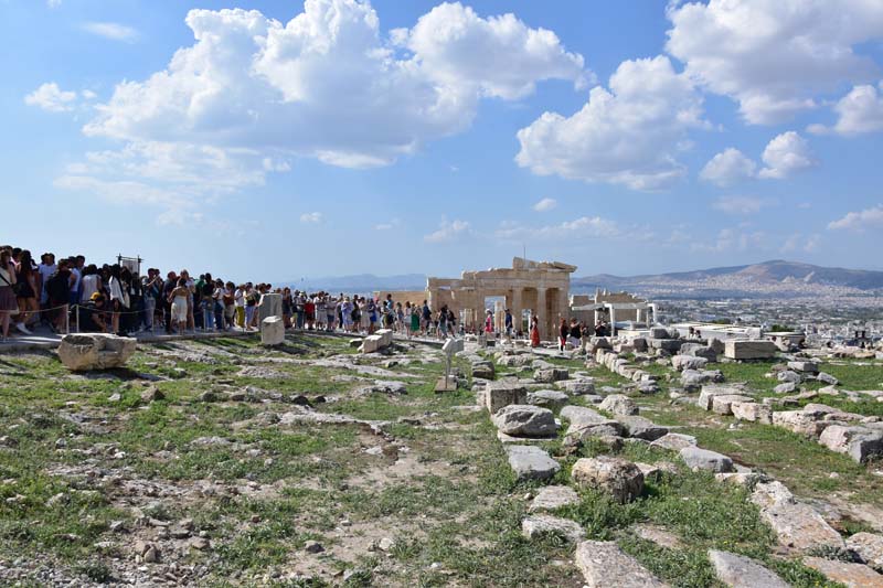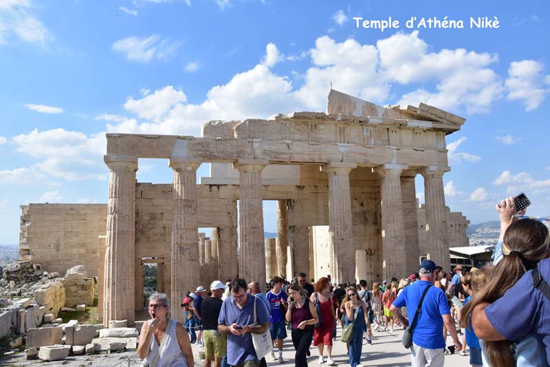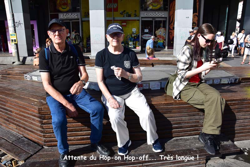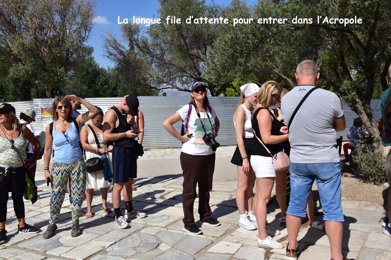 Après un passage par la pharmacie pour m’acheter des compresses (et oui, j’ai toute une pharmacie mais j’ai oublié les compresses, grrrrrr !) afin de soigner mes bobos, nous avons décidé d’acheter des billets pour le bus hop-on hop-off afin de rallier les principaux sites et monuments de la ville. Nous pensions gagner du temps (et de la fatigue en moins) mais en fait, il nous a fallu plus d’une heure et demie entre l’attente du bus et l’arrivée à l’Acropole. Dans l’absolu, on aurait pu y être en 20mn à pied, mais bon, c’est une sacrée grimpette que l’on voulait éviter. Mais nous n’étions pas à la fin de nos déboires ! Nous avions acheté des billets combinés 6 monuments, valables pendant 5 jours. A l’achat sur Internet, nous n’avions pas compris pourquoi il nous était demandé de choisir un créneau horaire. Nous avions donc choisi le plus tôt du matin du 1er jour de notre arrivée, pensant que cela déclenchait la validité du billet… Que nenni, c’était le créneau incontournable pour visiter l’Acropole, les autres monuments pouvant être visités n’importe quand. Quelle ne fut pas notre surprise et notre colère quand on nous a annoncé que nous devions nous racheter des billets pour l’Acropole (20€ par personne quand même – cher par rapport au billet combiné qui coûte 30€). Bref, nous n’avons pas eu le choix (nous n’étions d’ailleurs pas les seuls dans ce cas !) et nous voilà partis pour plus d’une heure de queue avant de pénétrer dans le saint des saints (Blandine s’est dévouée une fois de plus pour nous éviter la queue en plein soleil !). Au départ, la foule était immense, on n’ose pas imaginer ce que cela peut être au mois d’août !!! Heureusement, passé les propylées, l’espace s’élargit et cela devient plus vivable.