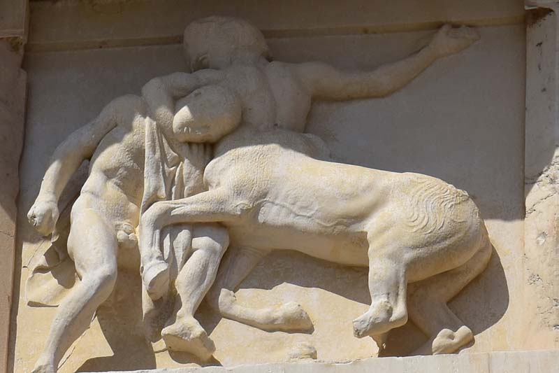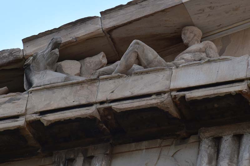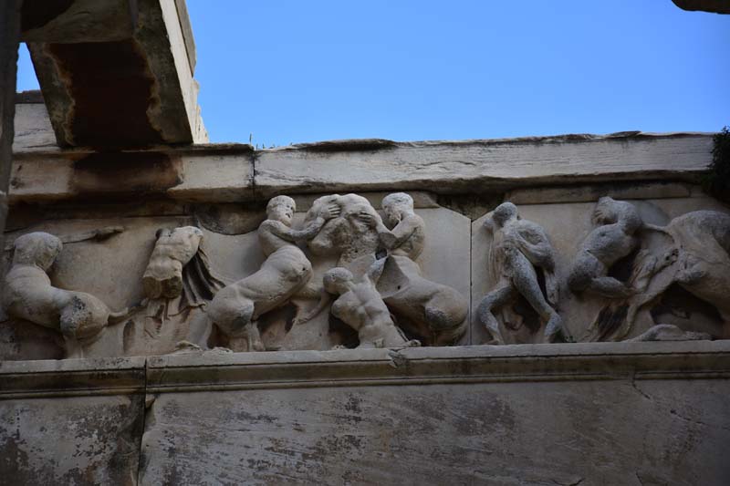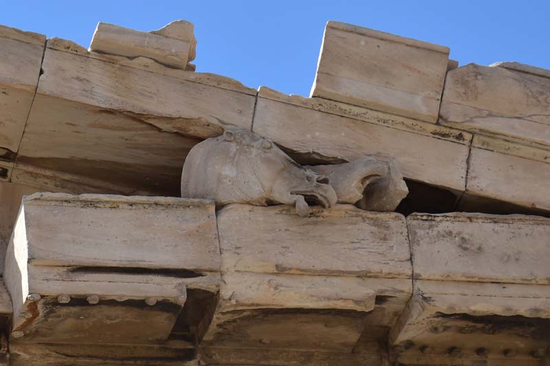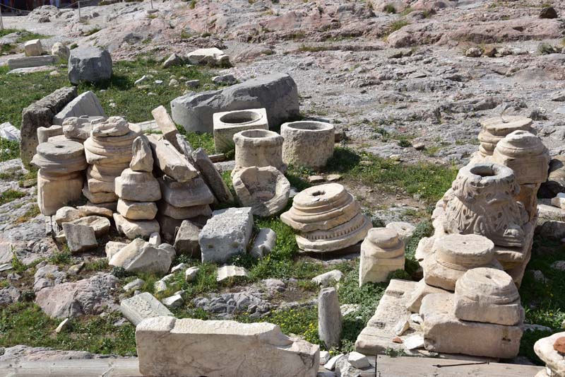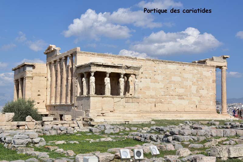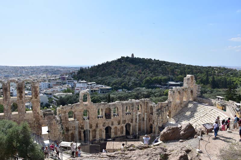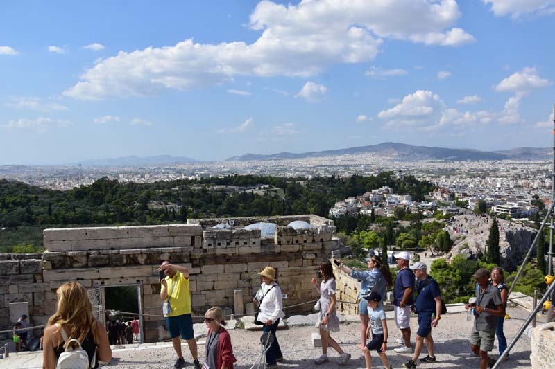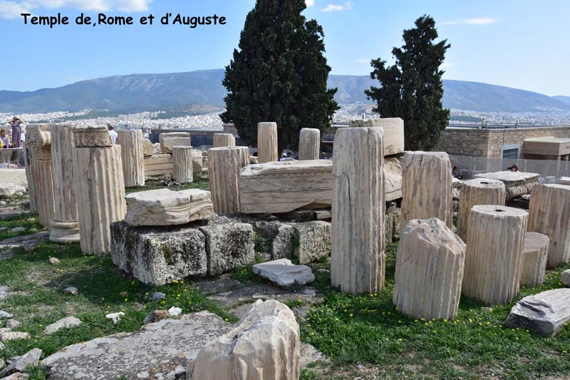 Après un passage par la pharmacie pour m’acheter des compresses (et oui, j’ai toute une pharmacie mais j’ai oublié les compresses, grrrrrr !) afin de soigner mes bobos, nous avons décidé d’acheter des billets pour le bus hop-on hop-off afin de rallier les principaux sites et monuments de la ville. Nous pensions gagner du temps (et de la fatigue en moins) mais en fait, il nous a fallu plus d’une heure et demie entre l’attente du bus et l’arrivée à l’Acropole. Dans l’absolu, on aurait pu y être en 20mn à pied, mais bon, c’est une sacrée grimpette que l’on voulait éviter. Mais nous n’étions pas à la fin de nos déboires ! Nous avions acheté des billets combinés 6 monuments, valables pendant 5 jours. A l’achat sur Internet, nous n’avions pas compris pourquoi il nous était demandé de choisir un créneau horaire. Nous avions donc choisi le plus tôt du matin du 1er jour de notre arrivée, pensant que cela déclenchait la validité du billet… Que nenni, c’était le créneau incontournable pour visiter l’Acropole, les autres monuments pouvant être visités n’importe quand. Quelle ne fut pas notre surprise et notre colère quand on nous a annoncé que nous devions nous racheter des billets pour l’Acropole (20€ par personne quand même – cher par rapport au billet combiné qui coûte 30€). Bref, nous n’avons pas eu le choix (nous n’étions d’ailleurs pas les seuls dans ce cas !) et nous voilà partis pour plus d’une heure de queue avant de pénétrer dans le saint des saints (Blandine s’est dévouée une fois de plus pour nous éviter la queue en plein soleil !). Au départ, la foule était immense, on n’ose pas imaginer ce que cela peut être au mois d’août !!! Heureusement, passé les propylées, l’espace s’élargit et cela devient plus vivable.