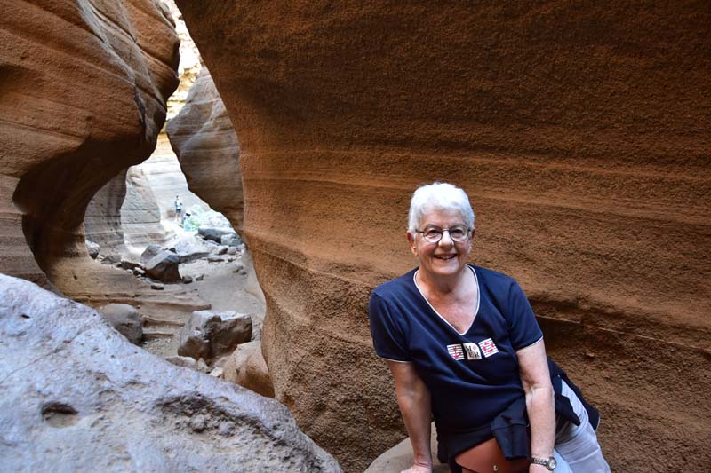 Il y a plusieurs chemins pour s’y rendre, le plus court (et de loin, peut-être une cinquantaine de mètres) est celui où il faut escalader la barrière de sécurité (donc pas toujours simple quand il faut lever bien haut la jambe 😂) mais il nous a paru très pentu, ce qui nous a fait peur (c’est si vite fait de glisser !). Nous avons donc choisi un autre petit chemin, plus éloigné mais qui nous semblait moins dangereux (en fait, après coup, nous pensons qu’il était encore plus difficile bien qu’un peu moins pentu) et beaucoup plus long. Nous y sommes quand même arrivés et avons pu profiter de ce petit « Antelope Canyon » d’Arizona presque tout seuls ! C’est un « couloir » qui fait une cinquantaine de mètres de long et qui se prête bien aux photos, à condition qu’il n’y ait pas trop de monde.