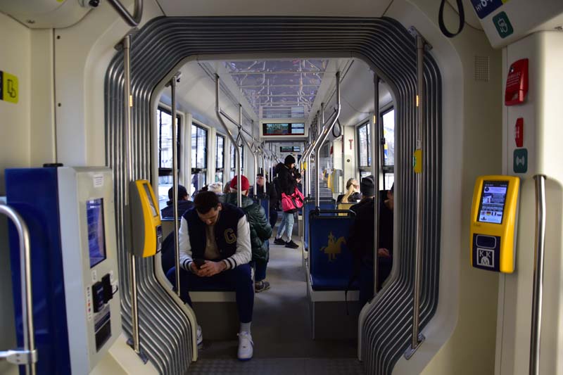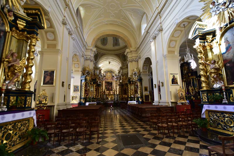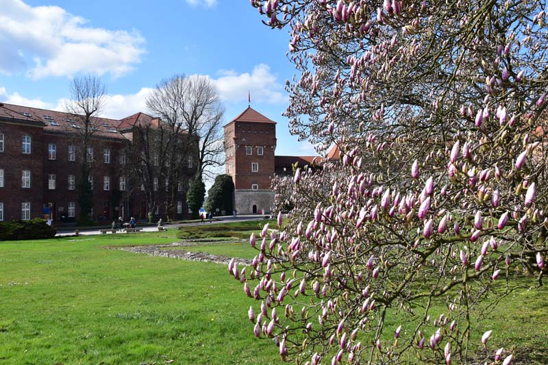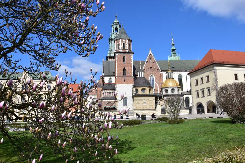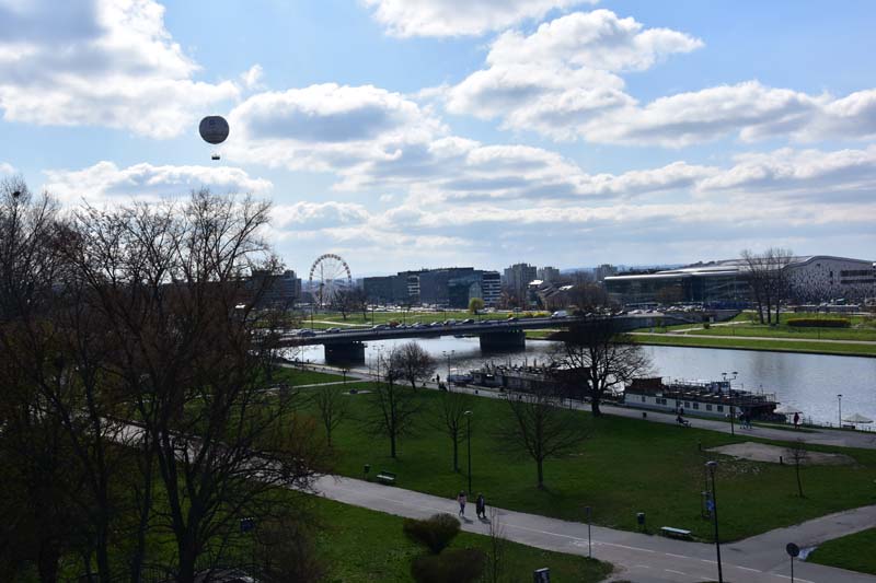 Nous aimons essayer les transports en commun des villes que nous visitons et nous n’avons pas dérogé à cette pratique, c’est pourquoi nous avons emprunté le tramway pour nous rendre de nouveau à la colline de Wawel où nous n’avions pas encore visité le château. Nous avons raté notre arrêt (!!!) et nous sommes arrêtés au suivant ce qui nous a permis de visiter la très jolie église des Bernardins. L’intérieur, de style baroque richement décoré, nous a ébloui avec ses dorures. Nous avons ensuite grimpé la colline pour nous retrouver dans les jardins, avec au passage, une jolie vue sur la Vistule.