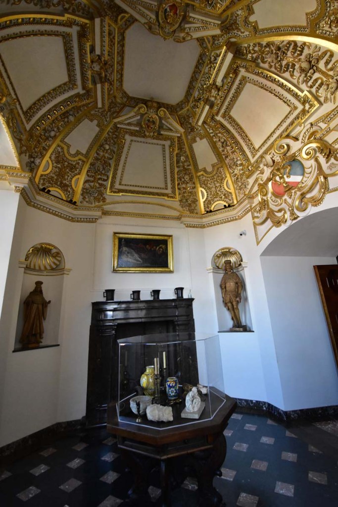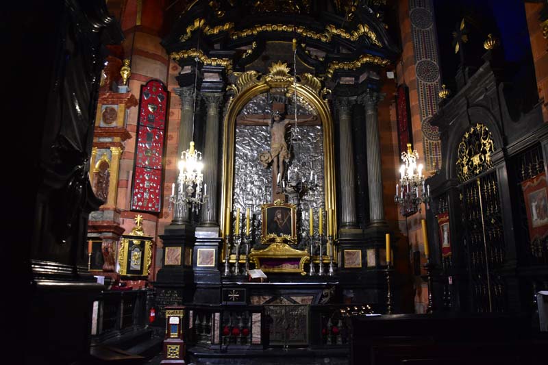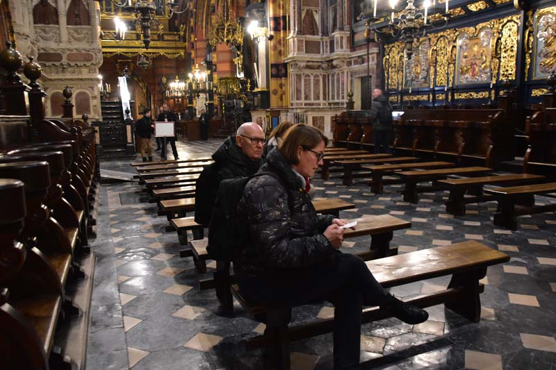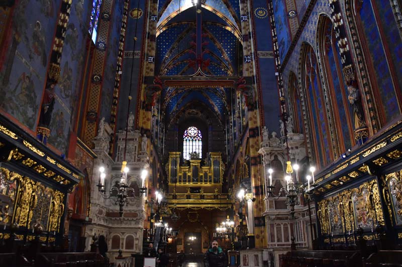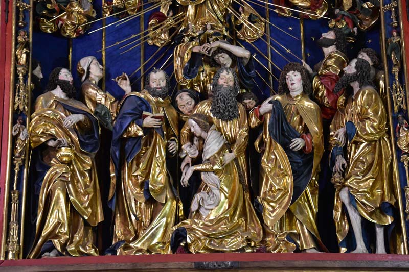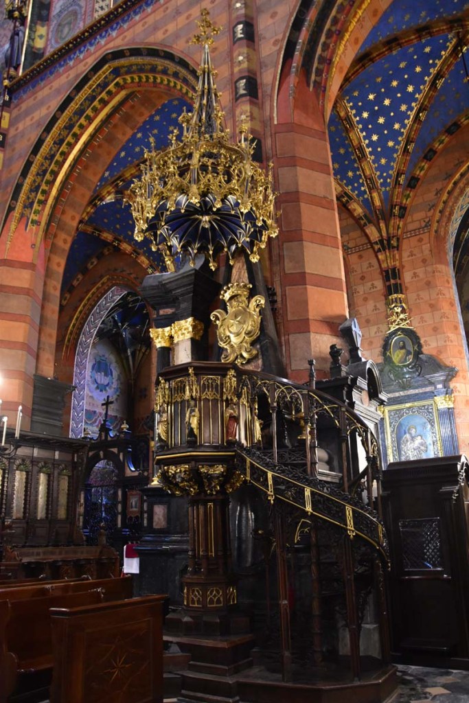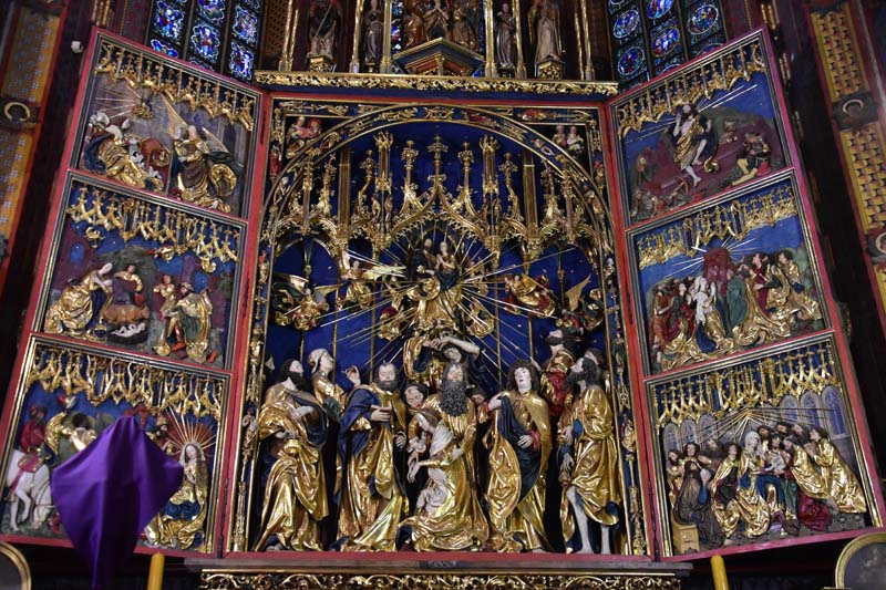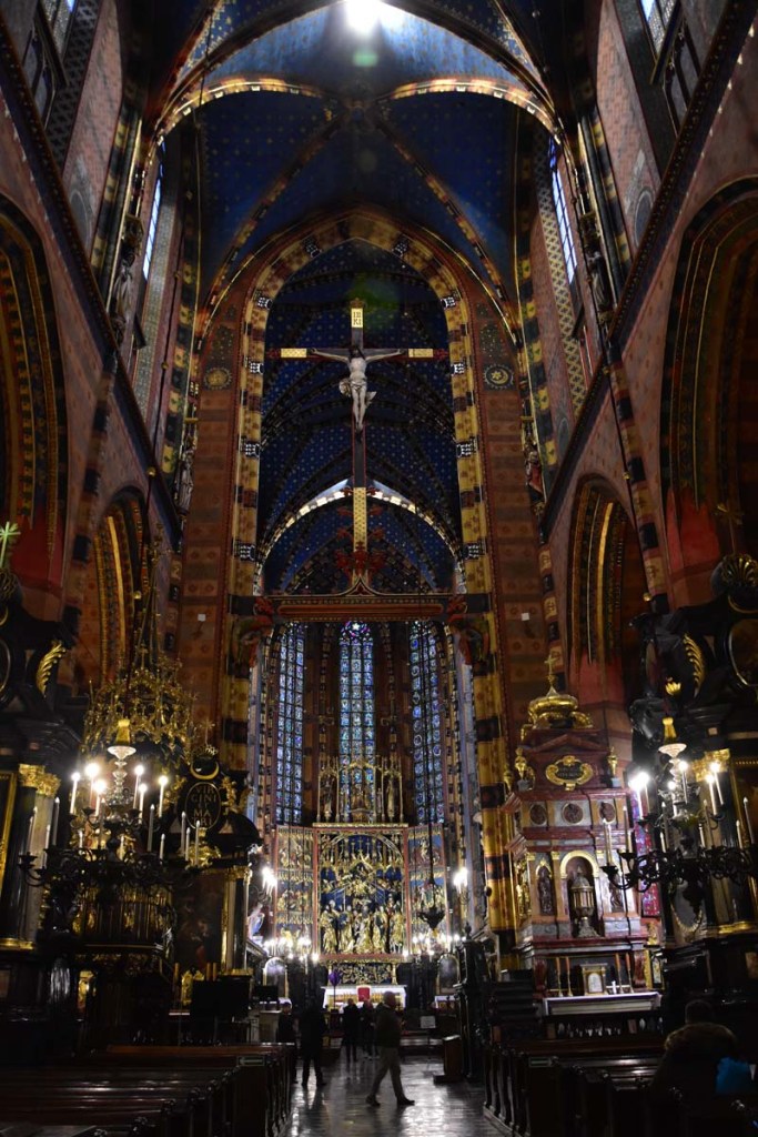 Il nous restait encore une chose que nous ne voulions pas rater, c’est l’intérieur de l’Eglise Notre-Dame que nous n’avions fait qu’apercevoir le premier jour puisqu’une messe y était célébrée quand nous y sommes passés. On remarque tout d’abord la hauteur de la nef, les fresques murales, raffinées et colorées et en levant les yeux, le remarquable plafond bleu couvert d’étoiles. C’est en accord parfait avec le somptueux retable qui mesure 13 mètres de haut et 11 mètres de large. C’est la pièce d’art médiéval la plus importante et la plus imposante du pays… Consacré en 1489, il demanda 10 ans de travail. Les vitraux qui entourent l’autel principal datent de la fin du 14ème siècle.