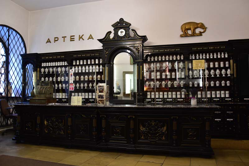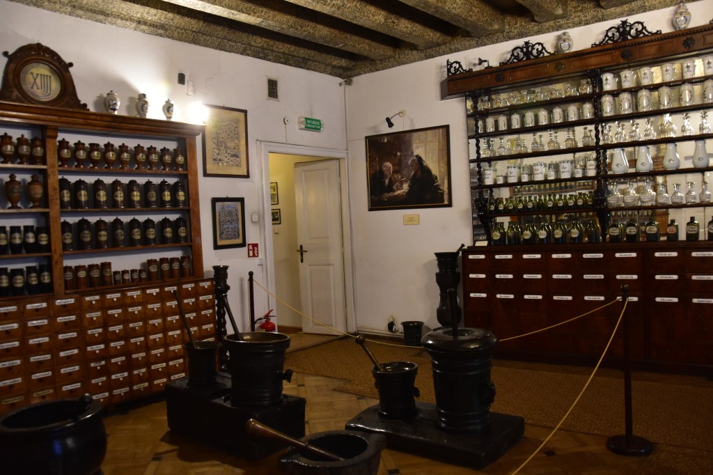 Nous avions envie de visiter le musée de la pharmacie, attraction réputée ici. Ce musée de l’école de médecine de l’université Jagellonne est l’un des plus vastes du genre en Europe, et peut-être le meilleur. Installé dans une maison de ville historique qui mérite à elle seule le détour, il présente une collection de 22 000 pièces : instruments anciens, flacons, jarres, ouvrages de médecine, etc. Vraiment très intéressant, nous y avons d’ailleurs passé un bon moment.