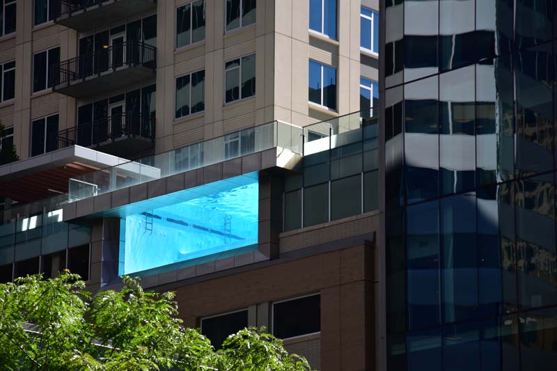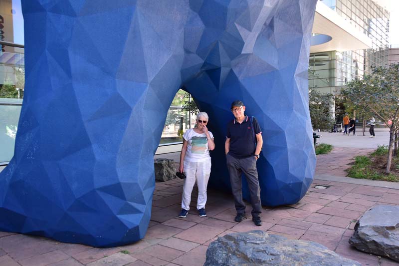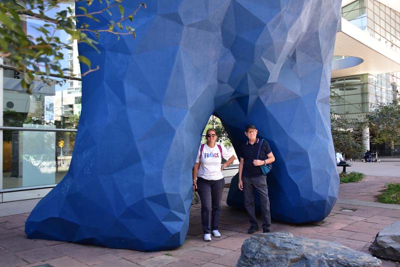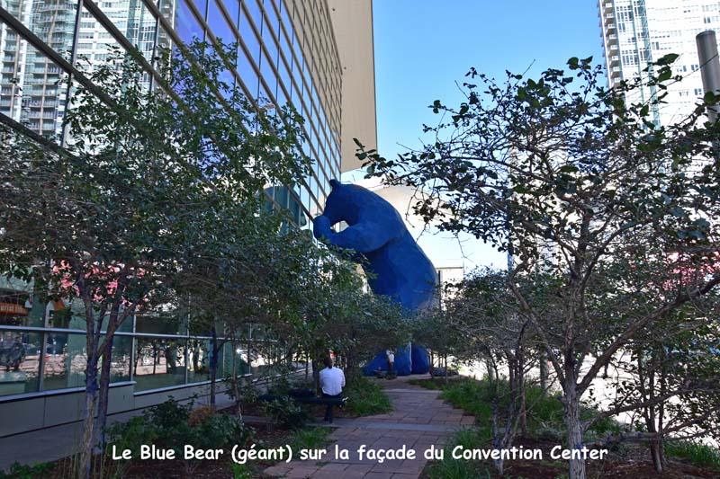 Tout d’abord, nous avons commencé par « l’ours bleu » puisqu’il se situe dans notre rue, à 2mn à pied… Il s’agit d’un gros ours bleu qui regarde par la fenêtre du Convention Center. Intitulée « I See What You Mean » (je vois ce que tu veux dire), l’œuvre de l’artiste Lawrence Argent mesure près de 13 mètres de haut. C’est très sympa pour se prendre en photo !!!