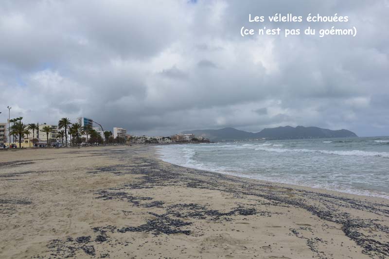Vous verrez dans les photos une drôle de bestiole, c’est une vélelle, cousine des méduses. Ma photo n’est pas très représentative car la vélelle est un disque cartilagineux surmonté d’une voile triangulaire rigide, elle est de couleur transparente à bleu foncé, et fait 6 cm de long maximum et 3 cm de haut. Elles s’échouent en masse au printemps (c’est ce qui recouvre notre plage et qui hélas, dégage une odeur par très agréable).