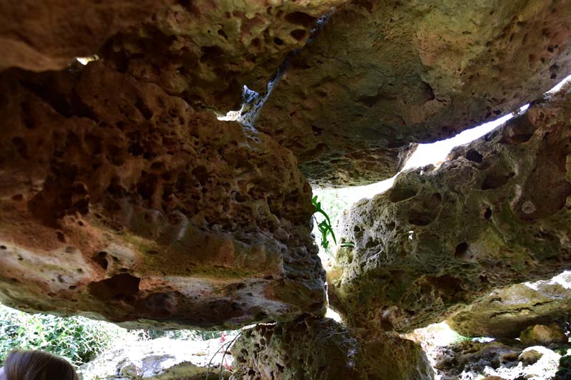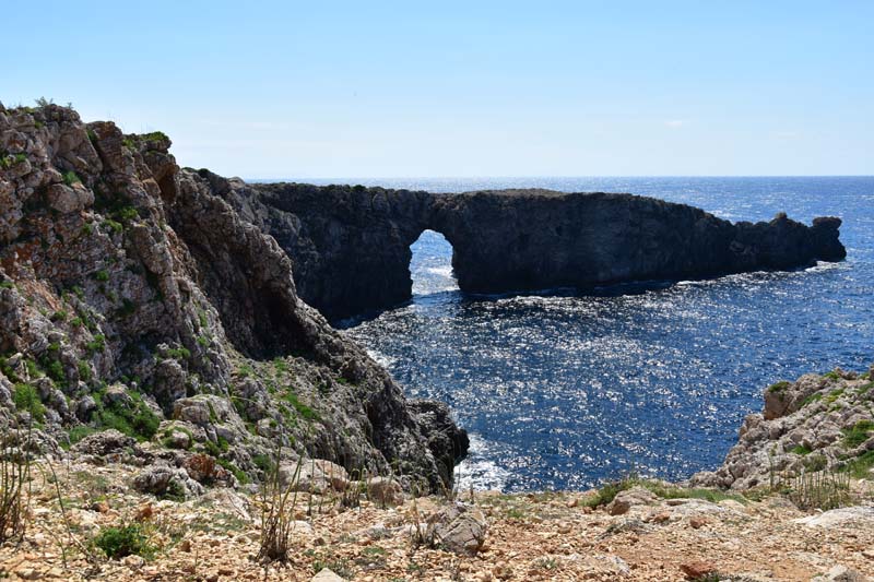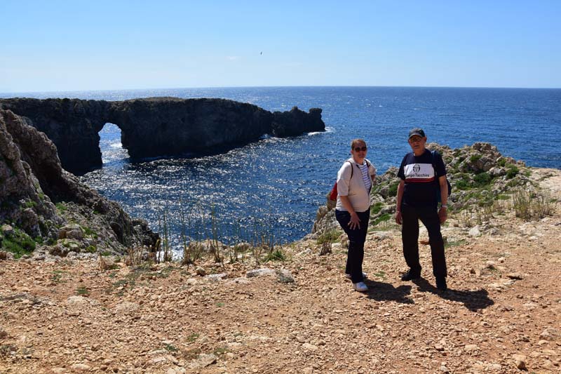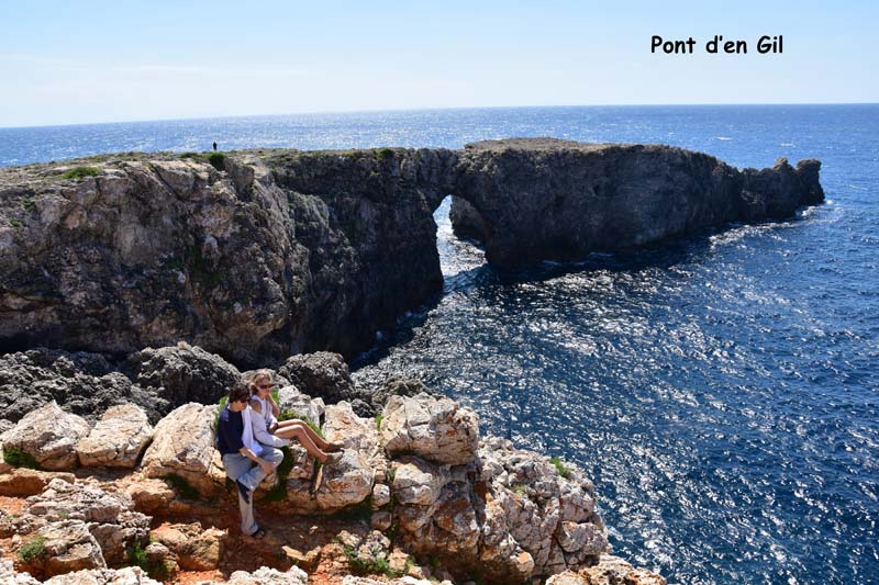 Nous étions à une trentaine de kilomètres de Ciutadella et nous avons voulu prolonger un peu les découvertes… Lors de notre premier séjour, nous étions allés voir une curiosité de Minorque que nous avons voulu montrer à Blandine, le Pont d’en Gil. C’est une arche naturelle qui vaut pour la balade le long de la mer. C’est sûr, ce n’est pas Etretat mais c’est bien sympa quand même.