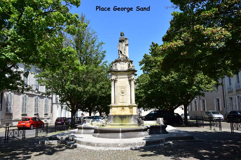 Après cet épisode religieux, nous avons repris le chemin de l’hôtel mais auparavant, nous voulions emprunter la promenade des remparts pour un passage au pied de l’ancien rempart gallo-romain (dont il ne reste que quelques vestiges). C’est une promenade très agréable sur un chemin bordé de fleurs et de jolies maisons… Nous nous sommes retrouvés sur la place George Sand avec sa fontaine édifiée dans les années 1880 qui représente une femme couronnée de tours, symboles de la ville.
