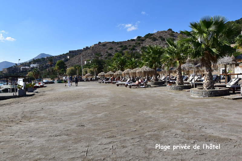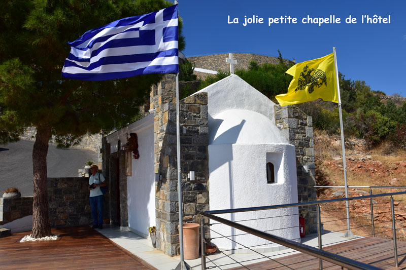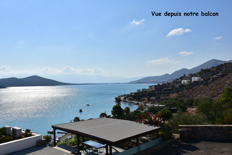 Nous sommes arrivés hier à Héraklion et après 1h30 de route, nous nous sommes installés dans notre très bel hôtel, situé à Elounda. Perché sur une colline qui surplombe la mer, et vu son architecture, les chambres ont toutes une vue sur l’océan. L’inconvénient, c’est qu’il faut toujours grimper (et c’est très, très pentu 🥵) pour aller d’un endroit à l’autre. Fort heureusement, il y a des ascenseurs et des voiturettes que l’on peut demander à la réception pour nous conduire où l’on veut aller… Bref, c’est impressionnant au départ et en fait, on apprend vite à utiliser les ascenseurs pour n’avoir que des descentes à faire pour rejoindre les endroits où l’on veut se rendre.