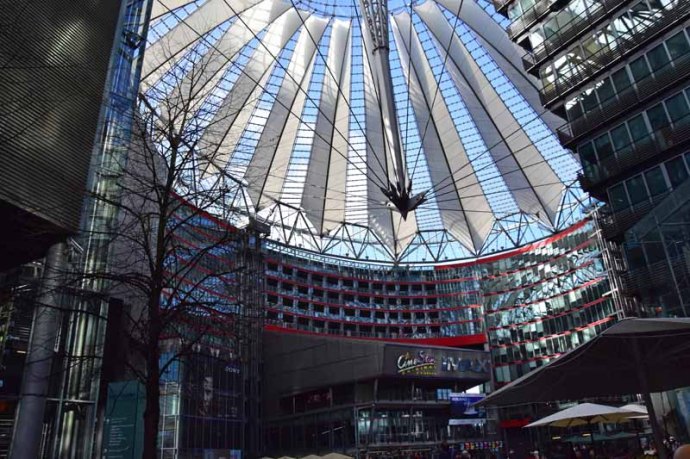 Nous nous sommes ensuite dirigés vers une place mythique, la Potsdamer Platz. Cœur de la cité des années 1920, rasée par les bombes alliées puis coupée en deux par le Mur, elle fut longtemps réduite à un vaste terrain vague. Aujourd’hui, elle est devenue le centre d’affaires et de commerce de la ville réunifiée. Nous avons beaucoup aimé son architecture moderne et particulièrement le Sony Center (quartier général de Sony Europe). C’est surtout à l’intérieur que ce complexe d’acier, de béton et de verre révèle ses charmes : une grande place de 4000m² coiffée d’un chapiteau spectaculaire. Les édifices alentours supportent un anneau massif d’où s’échappe un mât légèrement penché qui maintient le chapiteau en fibre de verre. Vraiment très chouette, d’autant qu’avec la Berlinale (le festival du film de Berlin), c’était très animé.