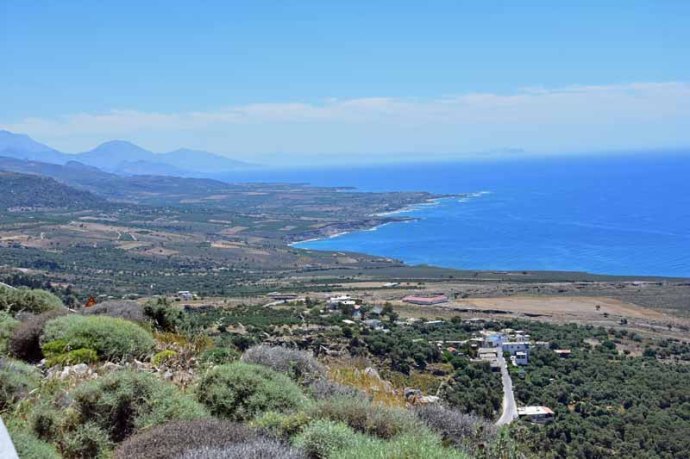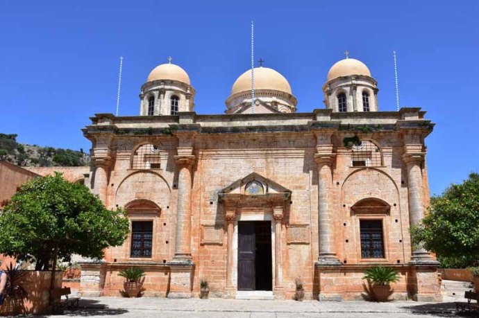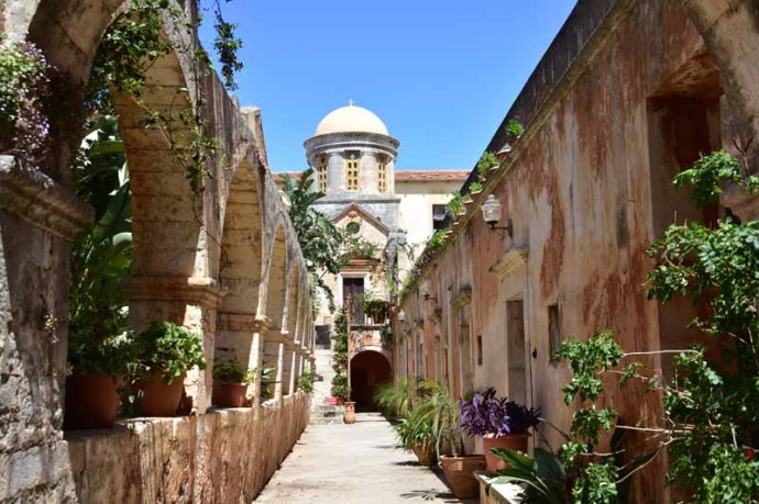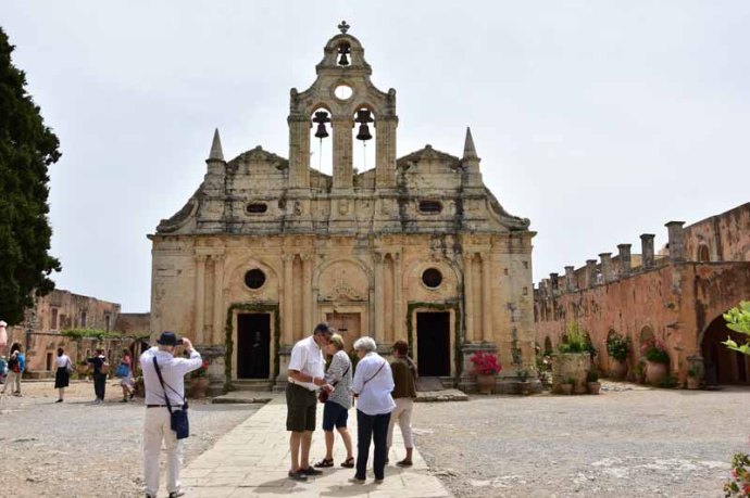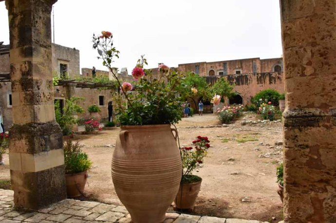 Nous avons donc commencé par le monastère d’Arkadi d’assez bonne heure (11h !) ce qui nous a permis d’être relativement epargnés par la foule de touristes. Ce monastère, grand complexe fortifié, situé à 500m d’altitude domine de belles gorges. L’église de la Transfiguration occupe le centre du couvent. Elle date de 1587 et est un pure joyau de la renaissance crétoise. Les fleurs abondantes dans l’enceinte en font une agréable promenade. Un peu d’histoire : le 8 novembre 1866, après 3 jours de siège, l’armée turque force les portes du monastère d’Arkadie où sont réfugiés quelques 960 crétois. Désarmés, ils choisissent de faire sauter la poudrière plutôt que de se rendre et c’est une hécatombe. Ce geste désespéré émeut l’opinion mondiale, sensibilisée par des écrits de Victor Hugo…