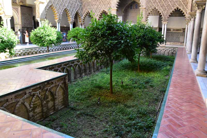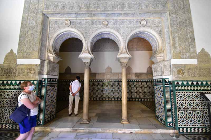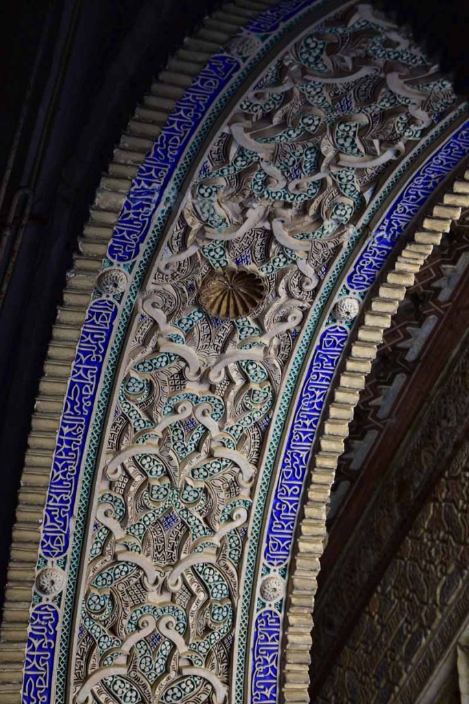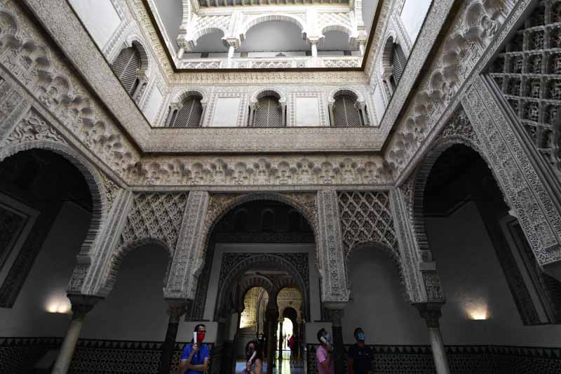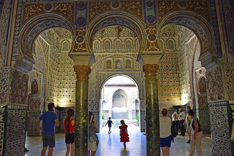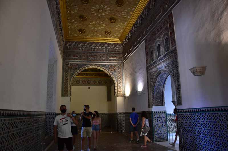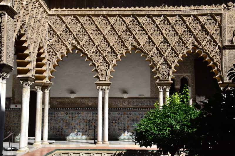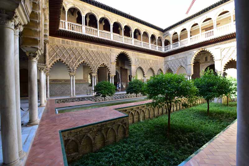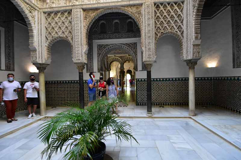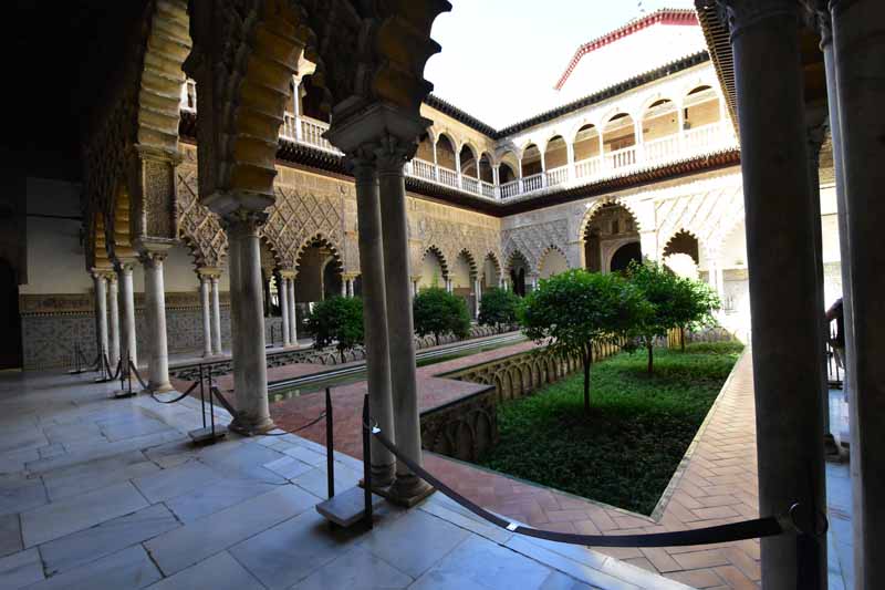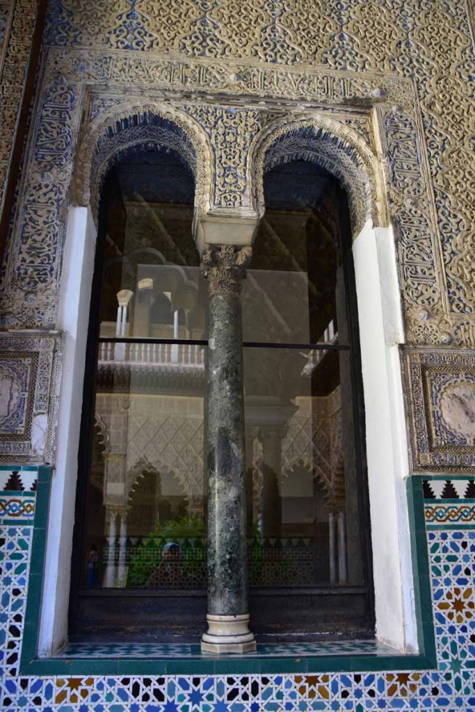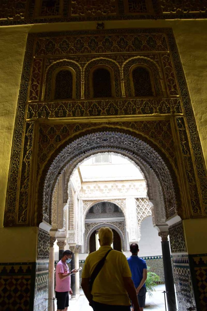 La résidence royale, avec ses patios, ses palais, ses salles Mudéjares et ses jardins est tout bonnement une pure merveille ! Traditionnellement, les Rois d’Espagne y descendent quand ils sont en visite à Séville (il faut savoir que dans ces cas là, on ne visite pas… ce qui apparemment est arrivé la semaine dernière puisque le Roi Felipe est venu à l’occasion du match de foot de l’Euro !!!). Pour une fois, on a eu de la chance. Par contre, nous n’avons pas pu visiter le palais royal lui-même car quand j’ai réservé les billets par internet, pour cause de covid, le palais n’était pas ouvert ! Il a rouvert cette semaine et donc, les groupes étaient déjà remplis…
