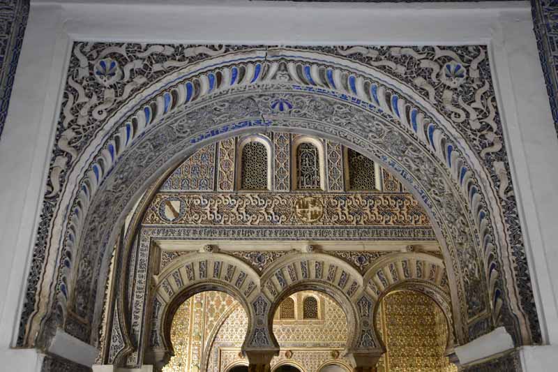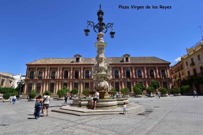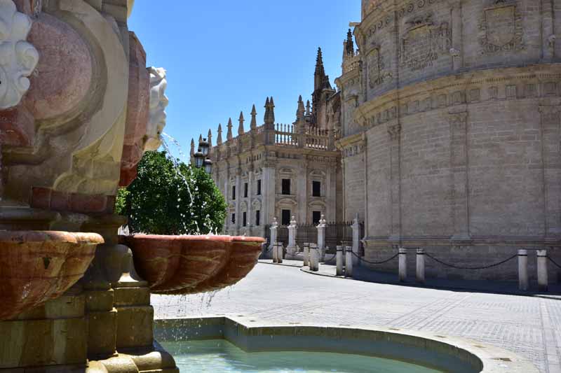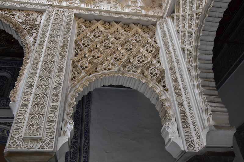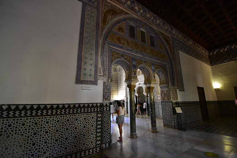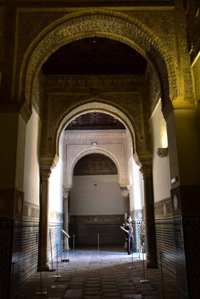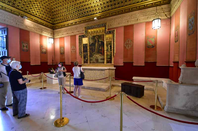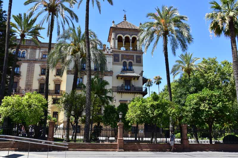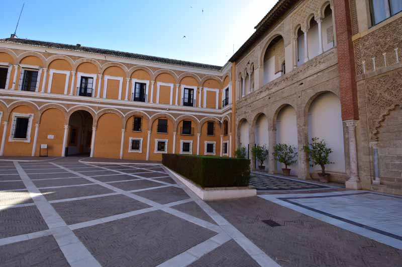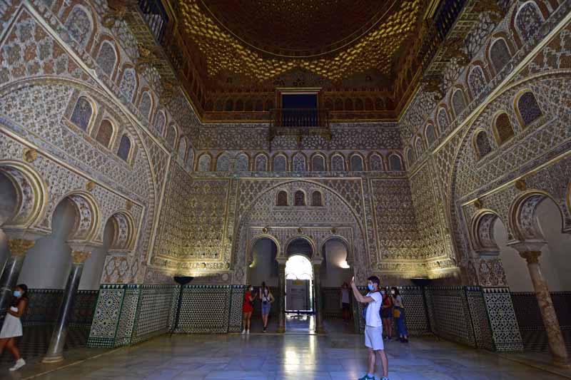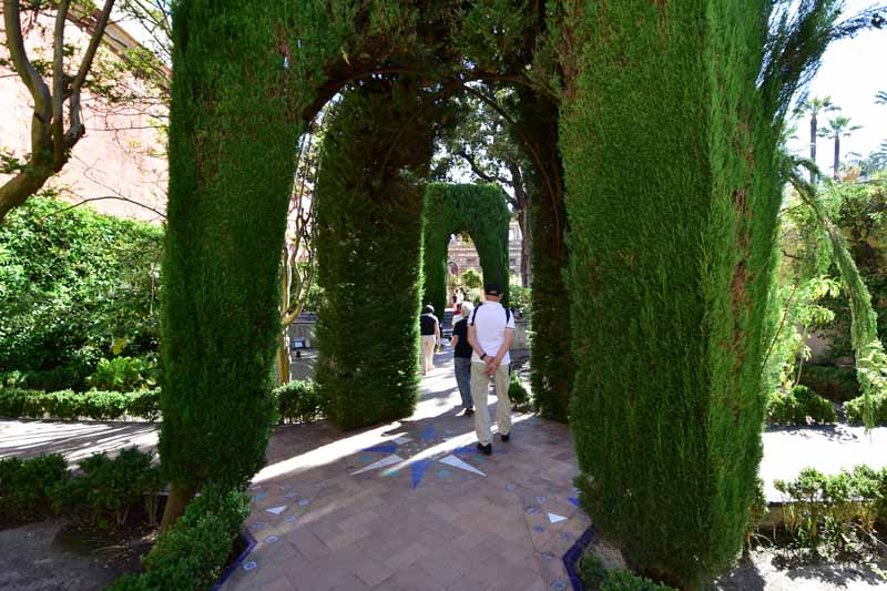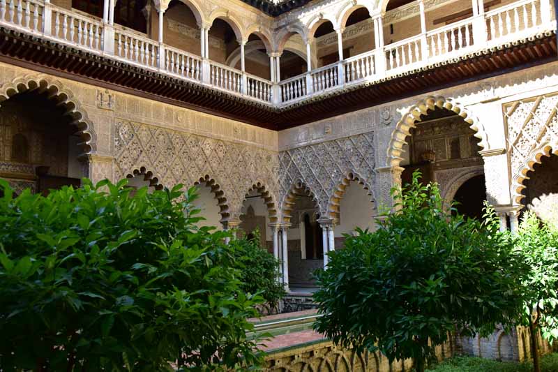 La résidence royale, avec ses patios, ses palais, ses salles Mudéjares et ses jardins est tout bonnement une pure merveille ! Traditionnellement, les Rois d’Espagne y descendent quand ils sont en visite à Séville (il faut savoir que dans ces cas là, on ne visite pas… ce qui apparemment est arrivé la semaine dernière puisque le Roi Felipe est venu à l’occasion du match de foot de l’Euro !!!). Pour une fois, on a eu de la chance. Par contre, nous n’avons pas pu visiter le palais royal lui-même car quand j’ai réservé les billets par internet, pour cause de covid, le palais n’était pas ouvert ! Il a rouvert cette semaine et donc, les groupes étaient déjà remplis…