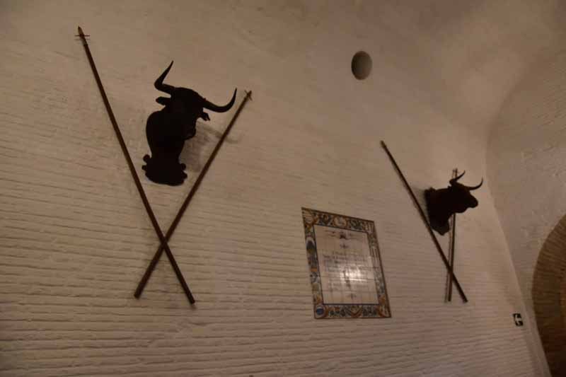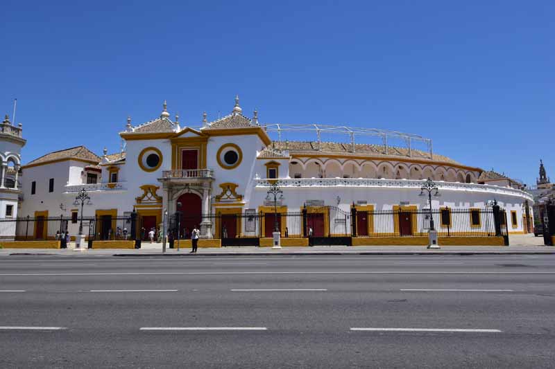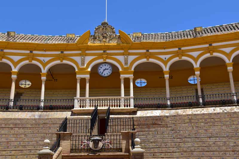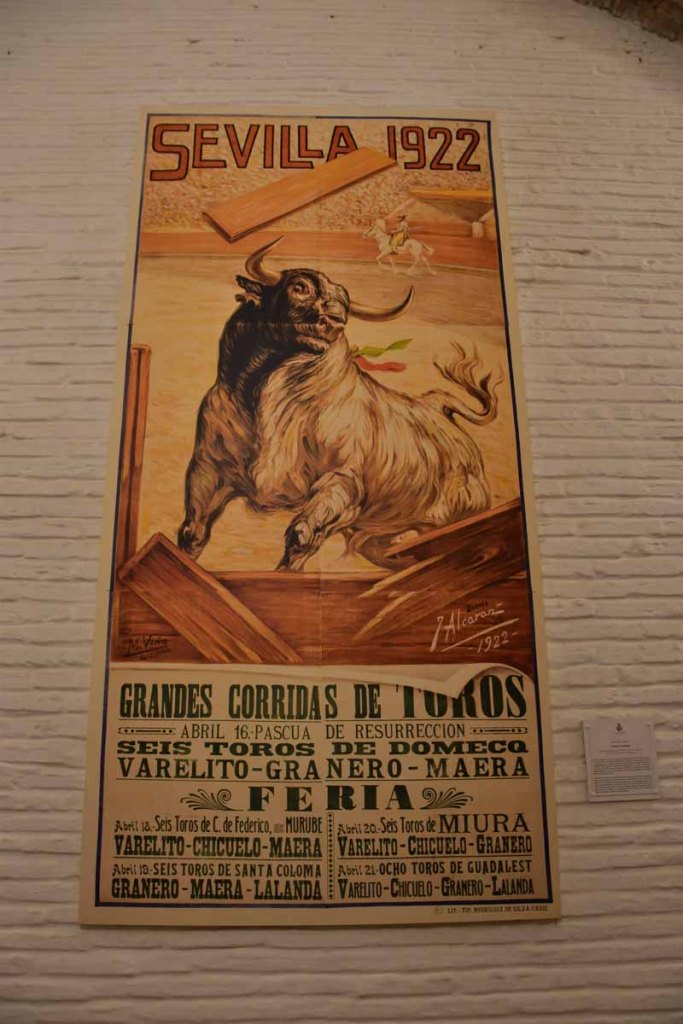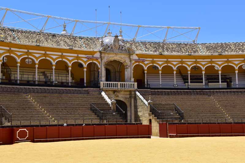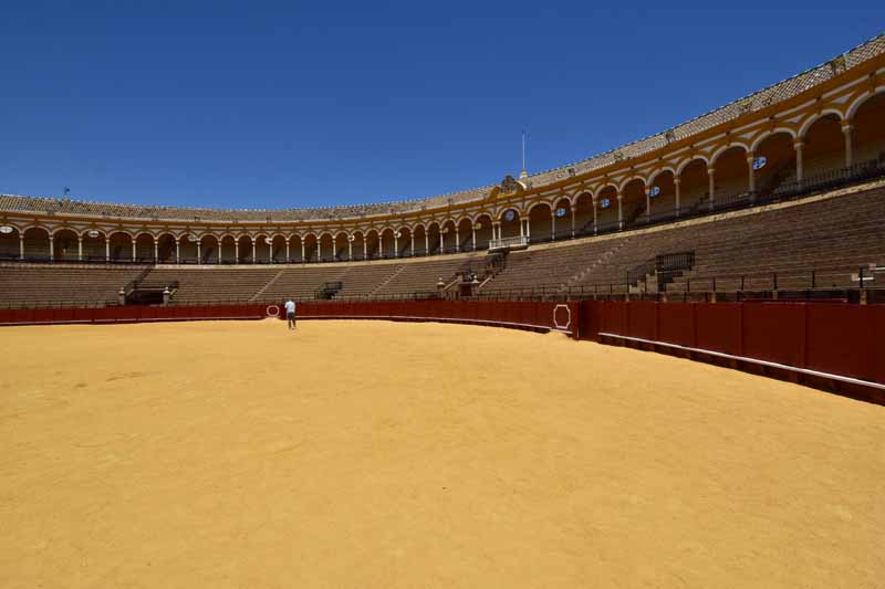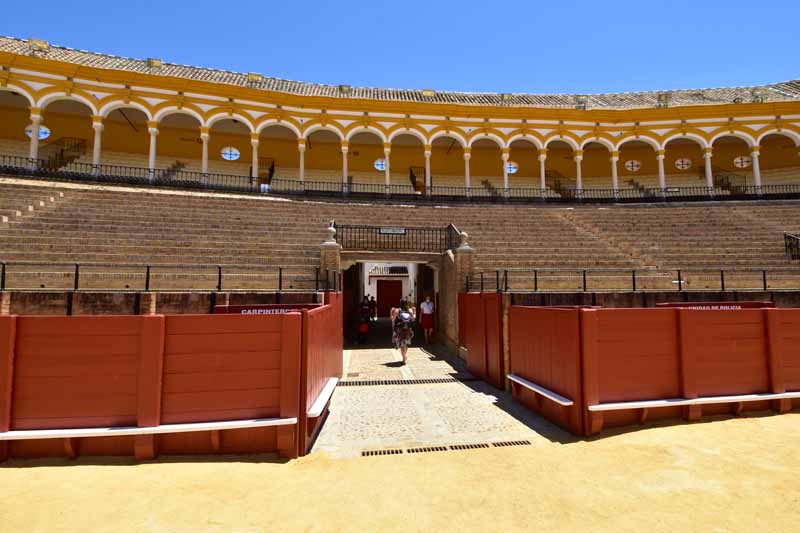 Finalement, nous sommes arrivés à la Plaza de Toros – la Maestranza – place mythique de la tauromachie, Séville étant l’une des capitales de la corrida. Encore notre jour de chance, la visite est gratuite le mercredi entre 14 et 16h et nous y étions un peu avant 16h. La construction commencée en 1761 s’est définitivement achevée 120 ans plus tard. Les plus grands noms de la tauromachie y ont toréé et cela durera tant que la tradition vivra… Les arènes peuvent accueillir jusqu’à 14000 spectateurs. Il y a même une chapelle où les toréadors peuvent prier avant d’entrer dans l’arène… C’est assez impressionnant de se retrouver dans cette immense arène, fort heureusement sans taureau !!!