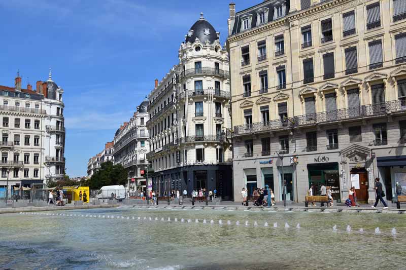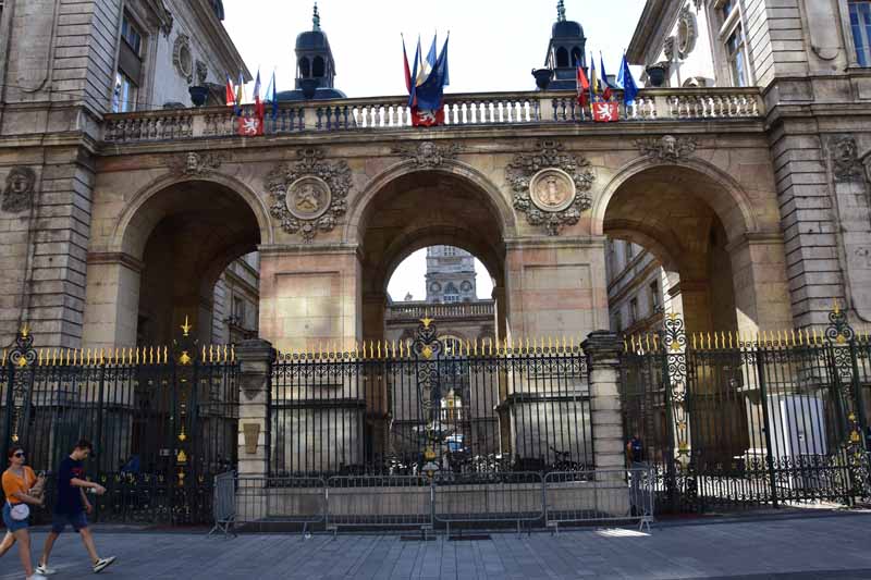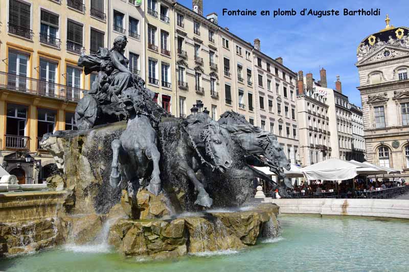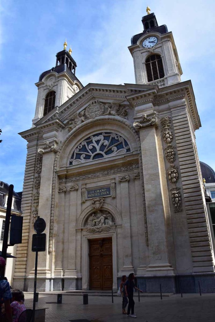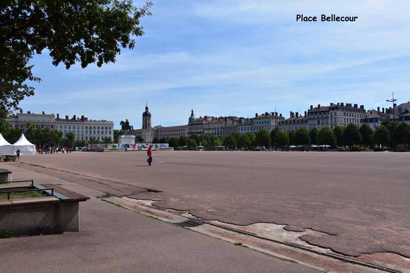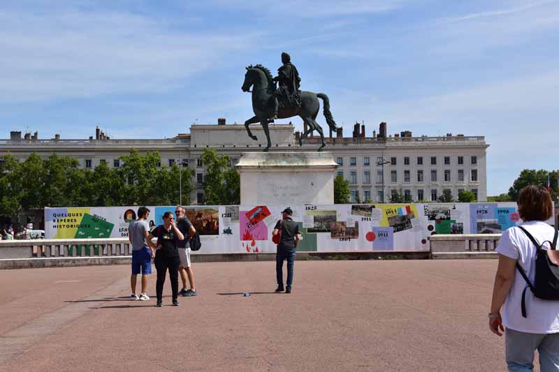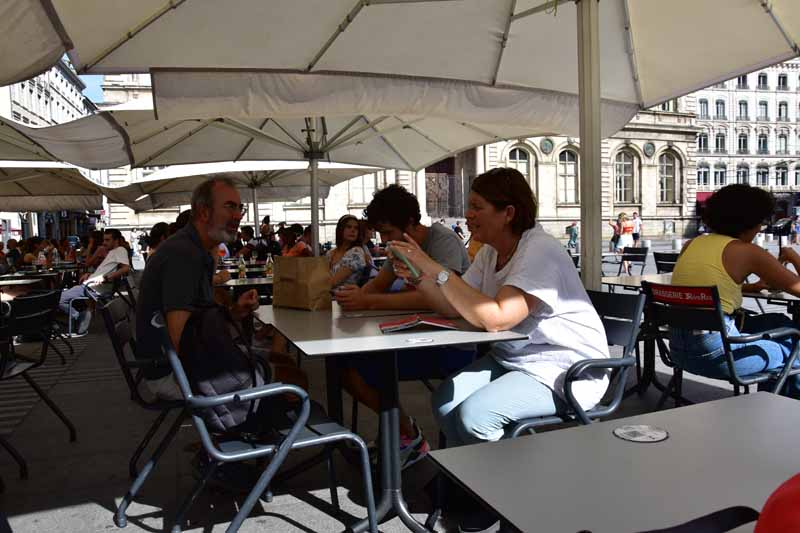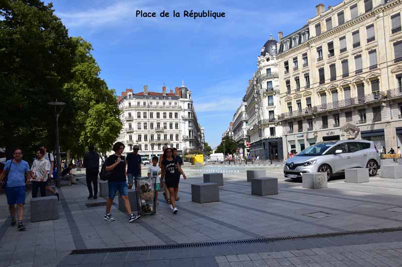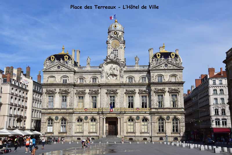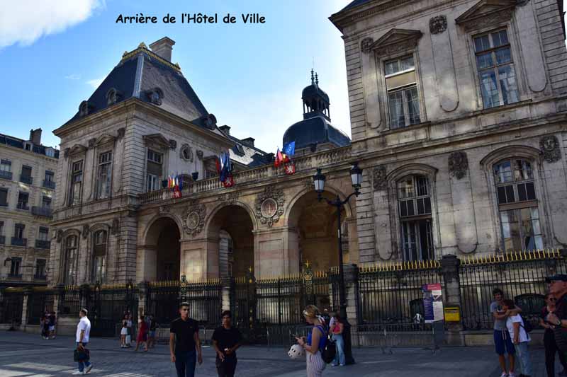 Après une pause grignotage, nous avons traversé le pont Bonaparte pour rejoindre le quartier de la Presqu’île et la place Bellecour (que nous avons surnommée Mochecour !), place monumentale qui serait un lieu incontournable de passage, rendez-vous et évènements… mais qui ne nous a pas du tout emballés. Il y faisait une chaleur torride, sans la moindre ombre, bref nous ne nous y sommes pas attardés. Nous avons encore flâné dans les rues, les places, les passages jusqu’à l’Hôtel de Ville. Au passage, nous avons longé l’Hôtel Dieu où Rabelais fut nommé médecin de l’hôpital en 1532 !