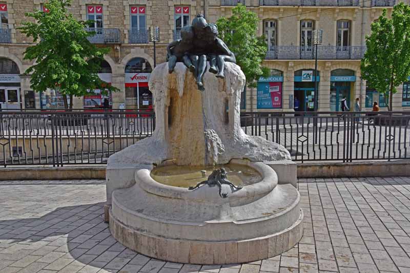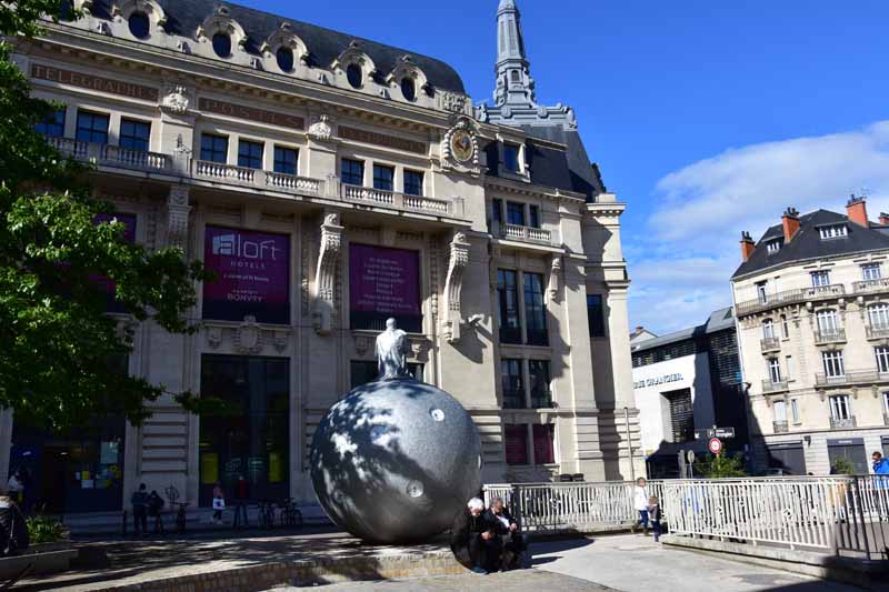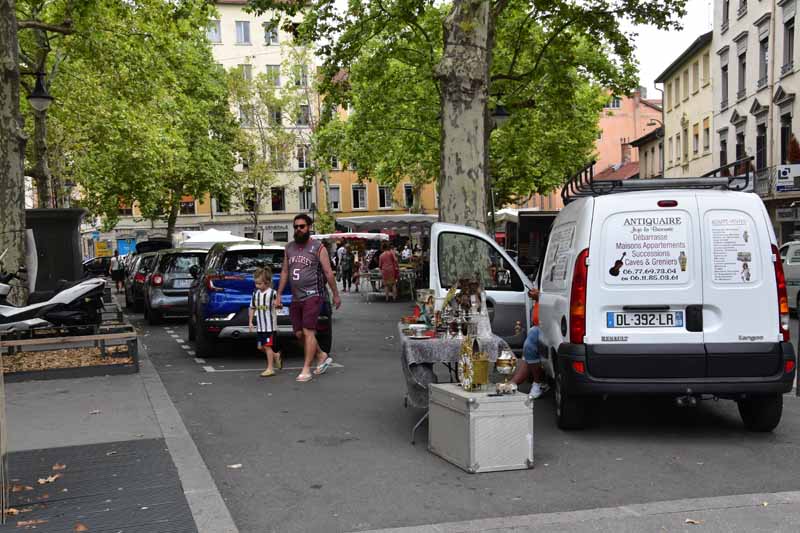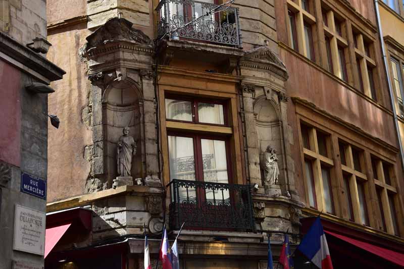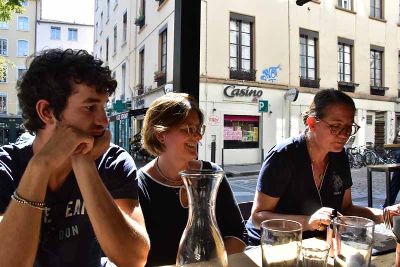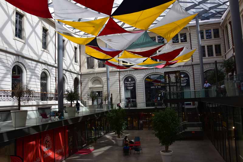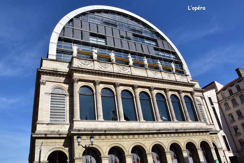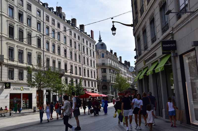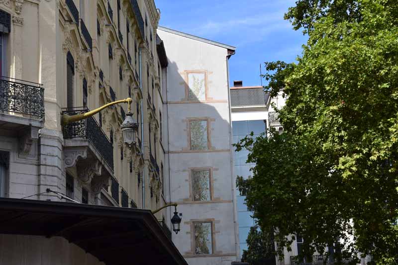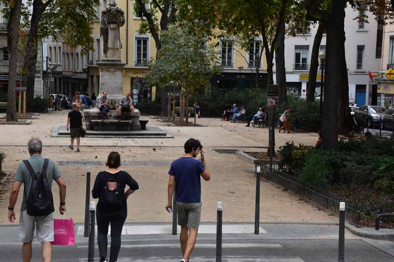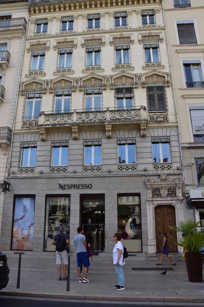 Après une pause grignotage, nous avons traversé le pont Bonaparte pour rejoindre le quartier de la Presqu’île et la place Bellecour (que nous avons surnommée Mochecour !), place monumentale qui serait un lieu incontournable de passage, rendez-vous et évènements… mais qui ne nous a pas du tout emballés. Il y faisait une chaleur torride, sans la moindre ombre, bref nous ne nous y sommes pas attardés. Nous avons encore flâné dans les rues, les places, les passages jusqu’à l’Hôtel de Ville. Au passage, nous avons longé l’Hôtel Dieu où Rabelais fut nommé médecin de l’hôpital en 1532 !
