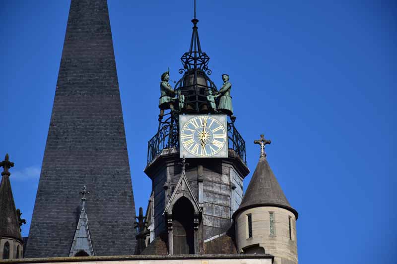 Elles est surmontée du « Jacquemart », prise de guerre de Philippe le Hardi, qui rythme toujours la vie du quartier. C’est une belle histoire que celle de Jacquemart : Le Duc prit cette horloge à Courtrai (Belgique) en 1382 et l’offrit aux dijonnais, chez lesquels elle arriva en 1383, en reconnaissance de leur aide dans la guerre des Flandres. Au XVIIe siècle, le célibat de Jacquemart ayant été plaisamment moqué, on lui adjoignit en 1651 une compagne : Jacqueline. En 1714, ce fut leur stérilité qui fut raillée et on leur fabriqua alors un petit Jacquelinet, rejoint en 1884 par Jacquelinette, pour frapper les quarts d’heure avec lui !!!