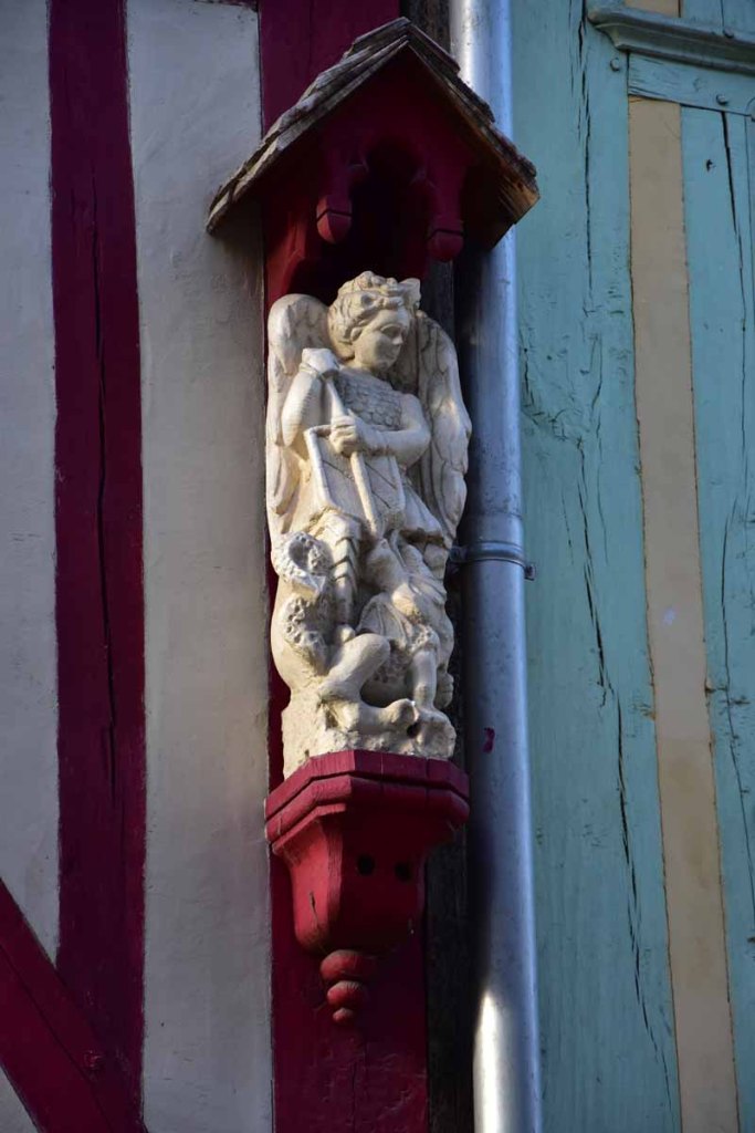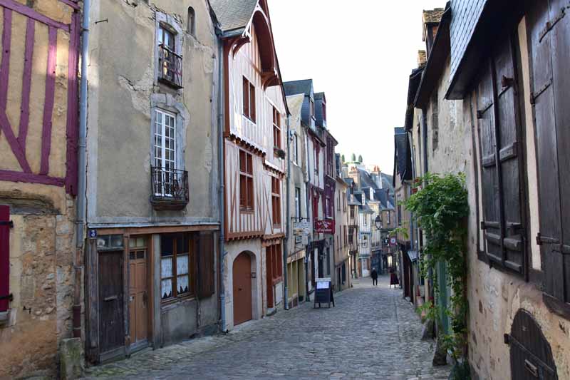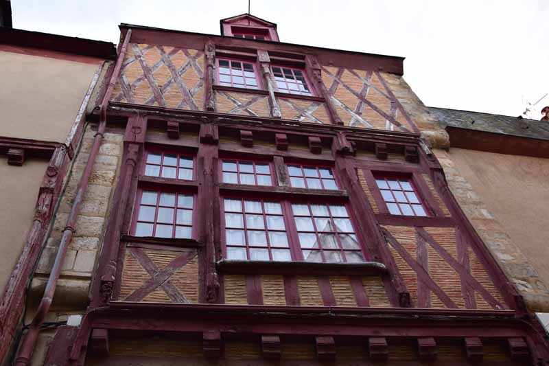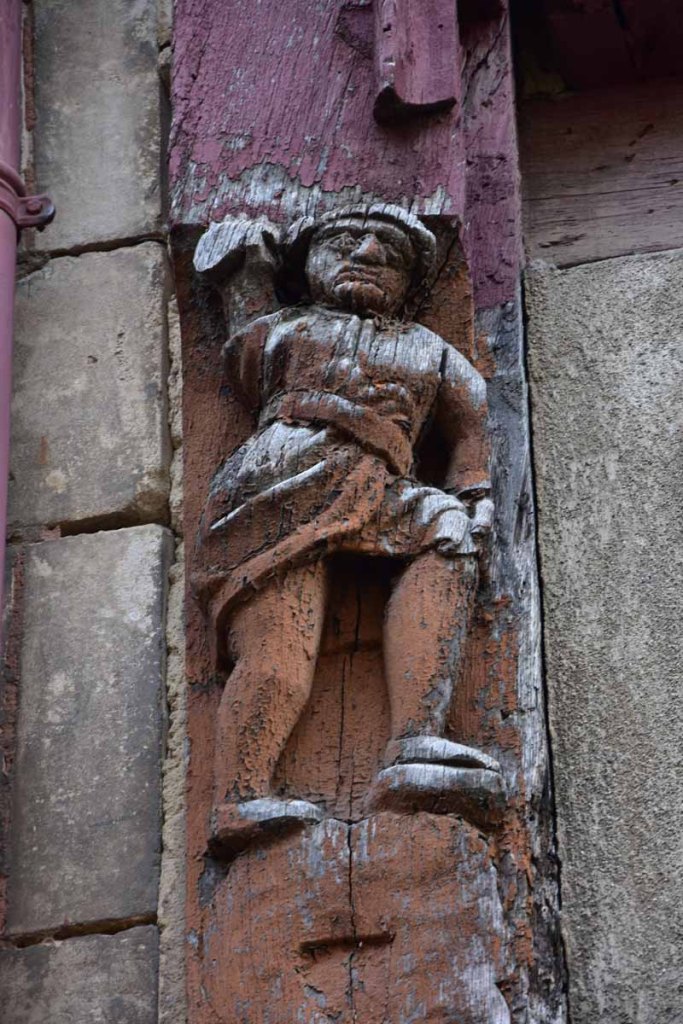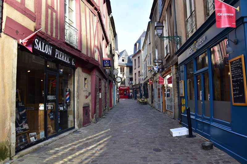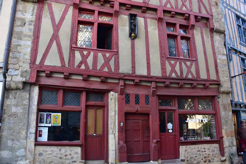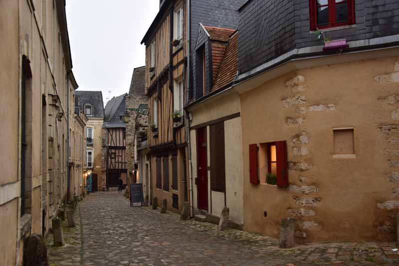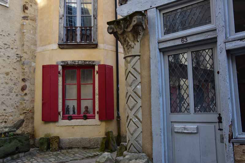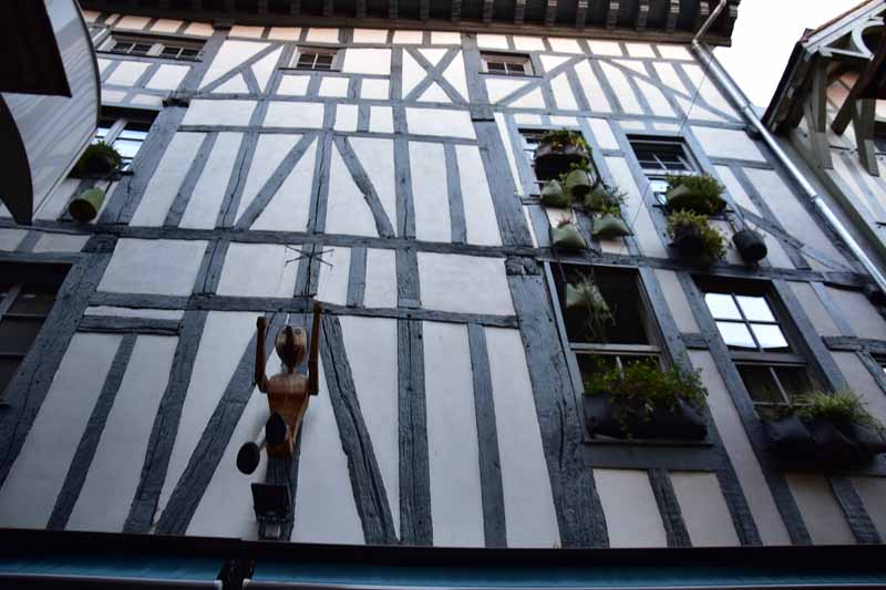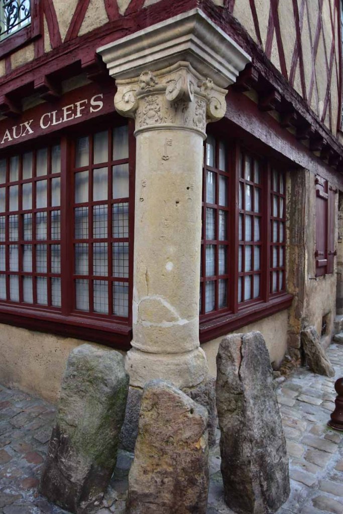 Nous avons été charmés et, incultes que nous sommes, très étonnés de découvrir une cité médiévale au Mans car pour nous, comme pour beaucoup de gens je pense, Le Mans se résumait à la célèbre course des 24 heures ! Erreur grossière. Nous avons parcouru avec délice toutes ces ruelles pavées (d’accord, c’est un peu fatiguant…) bordées de chasse-roues qui avaient pour mission de préserver des roues des charriots les murs des maisons. Plus d’une centaine de maisons en pan-de-bois, datant en majorité des 15ème et 16ème siècles, offrent leurs belles façades à nos regards curieux. Certaines sont ornées d’un pilier d’angle (ou pilier cornier) : pilier rouge, pilier vert, pilier aux clés etc… qui représentaient à l’époque des enseignes commerciales mais étaient aussi un moyen de se repérer en l’absence de tout nom donné aux rues ou de numérotation des maisons.
