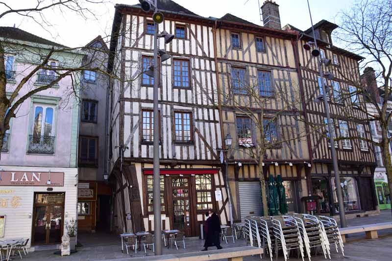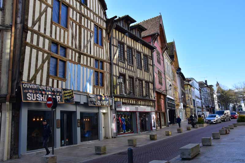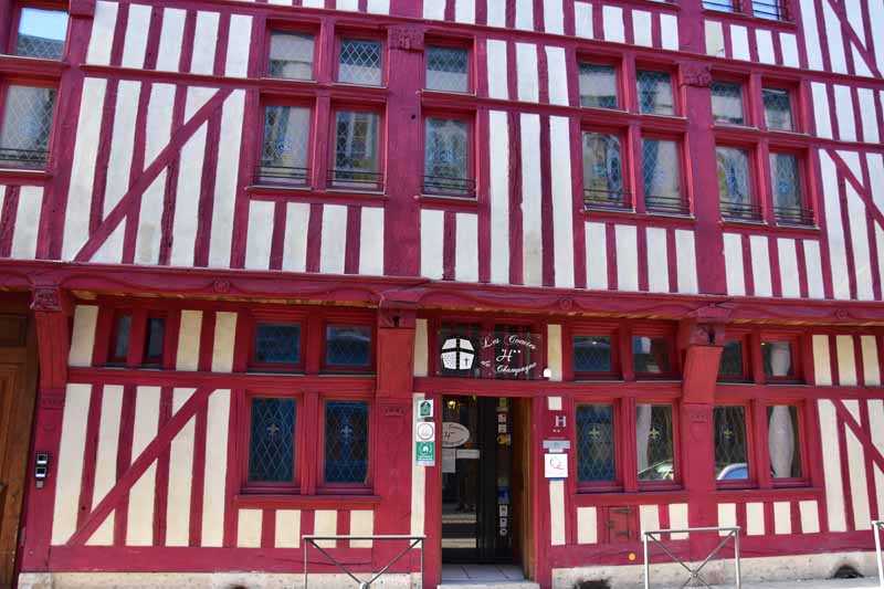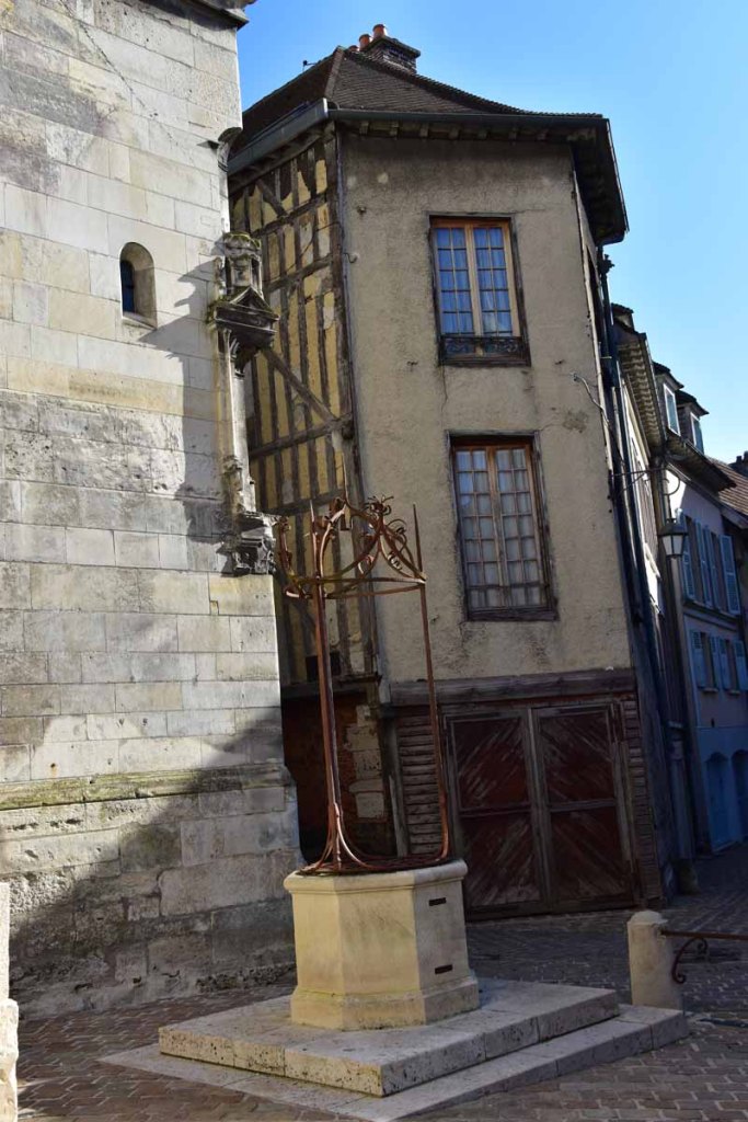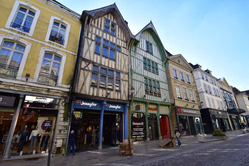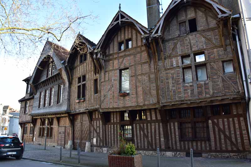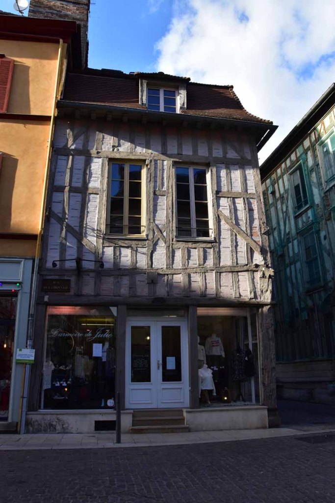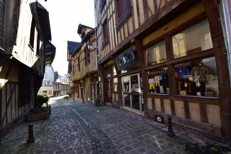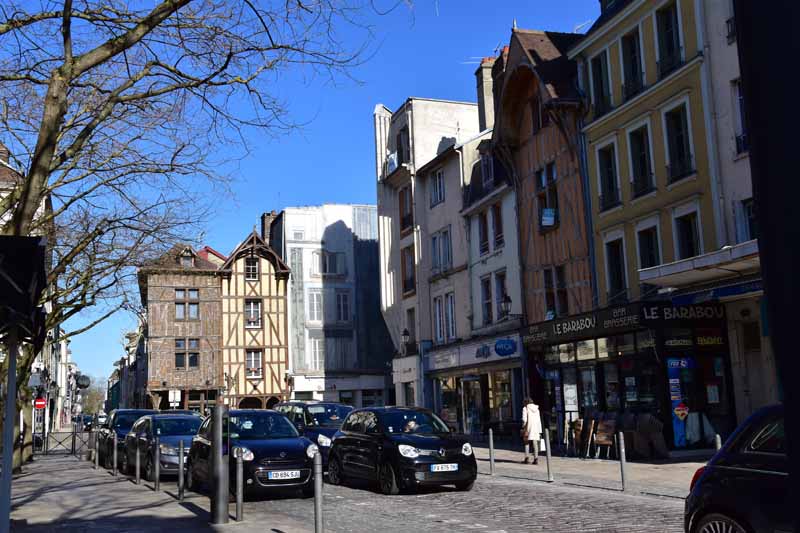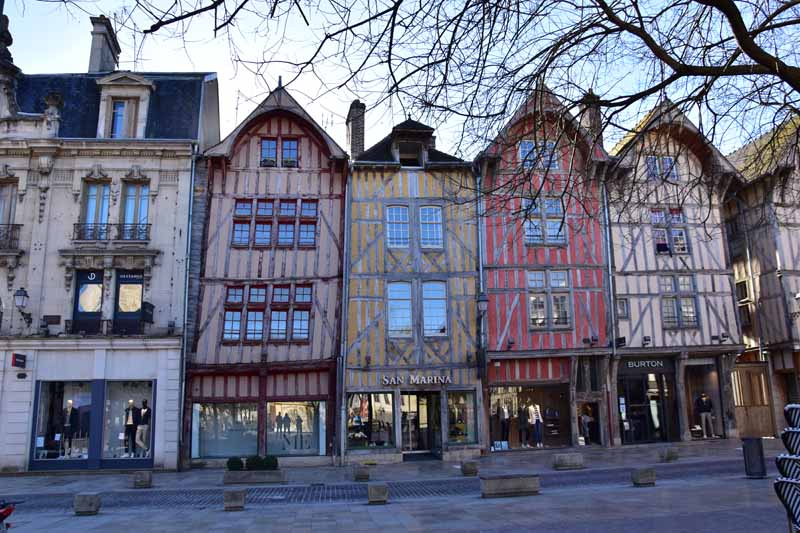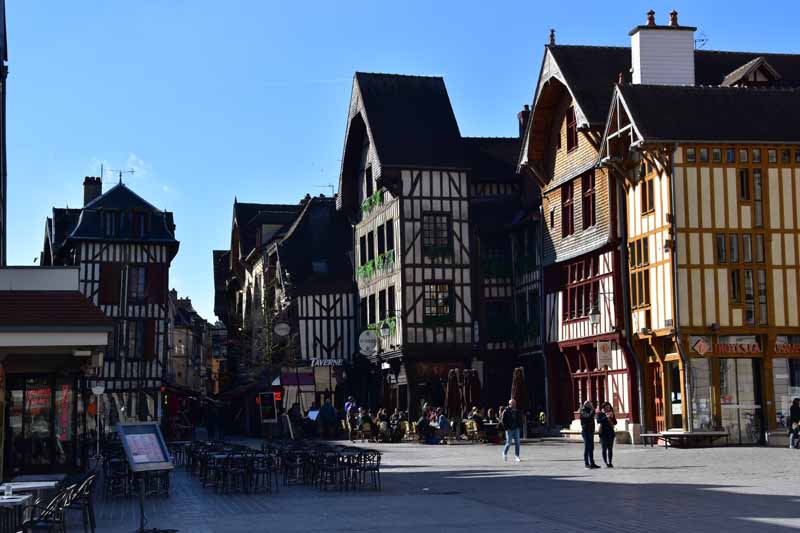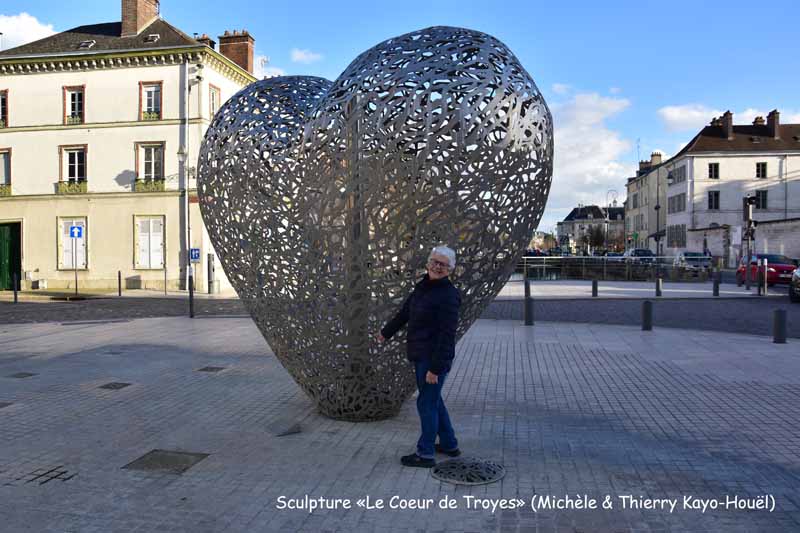 Troyes est la capitale historique de la Champagne et, bizarrement, à y regarder de plus près, on observe que le tracé du contour de la vieille ville a la forme d’un bouchon de champagne… ça ne s’invente pas ! C’est au cœur du 16ème siècle que nous sommes transportés : les ruelles pavées cheminent au milieu d’un vaste centre piéton, très homogène, entre les maisons à pans de bois (le plus grand ensemble qui subsiste de nos jours en France) superbement rénovées et les monuments religieux (cathédrale, basilique et églises) avec leurs magnifiques vitraux qui font que de nombreux spécialistes ont baptisé Troyes « Ville Sainte du Vitrail ». Un musée du vitrail existe d’ailleurs, que nous voulions aller visiter, mais hélas il était fermé… La ville s’est développée grâce au dynamisme commercial datant des foires médiévales (les fameuses foires de Champagne), au rayonnement artistique et culturel de l’école champenoise de sculpture du 16ème siècle et, enfin, au savoir-faire industriel. Troyes s’est érigée en capitale de la bonneterie dès le 19ème siècle, je me souviens maman travaillant, entre autre, pour Valton (qui n’est autre que la marque Petit-Bateau). Tout le monde avait du travail à l’époque, ce qui n’a pas été la même chose quand nous sommes arrivés en Bretagne !