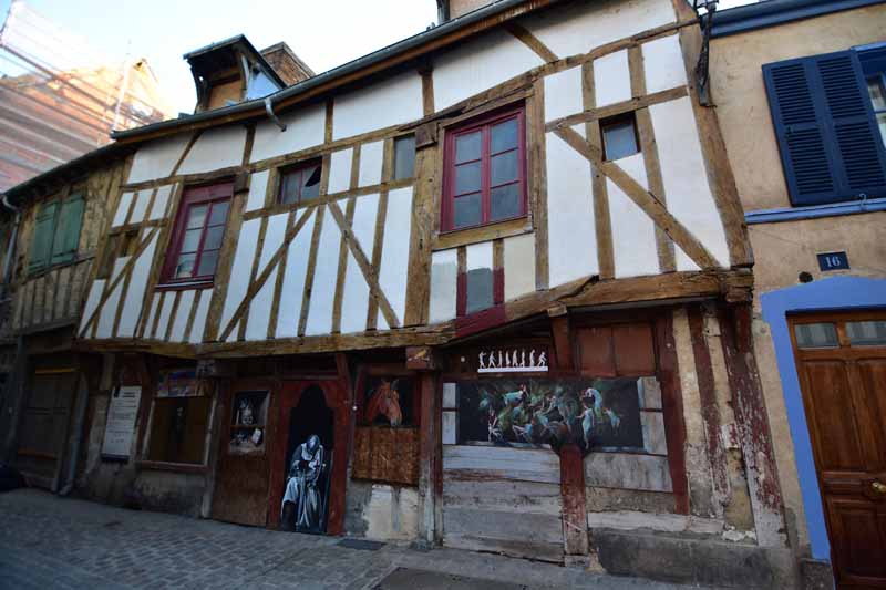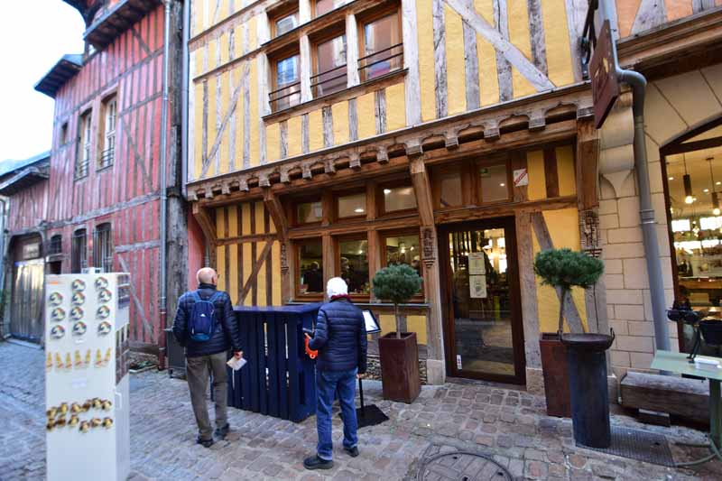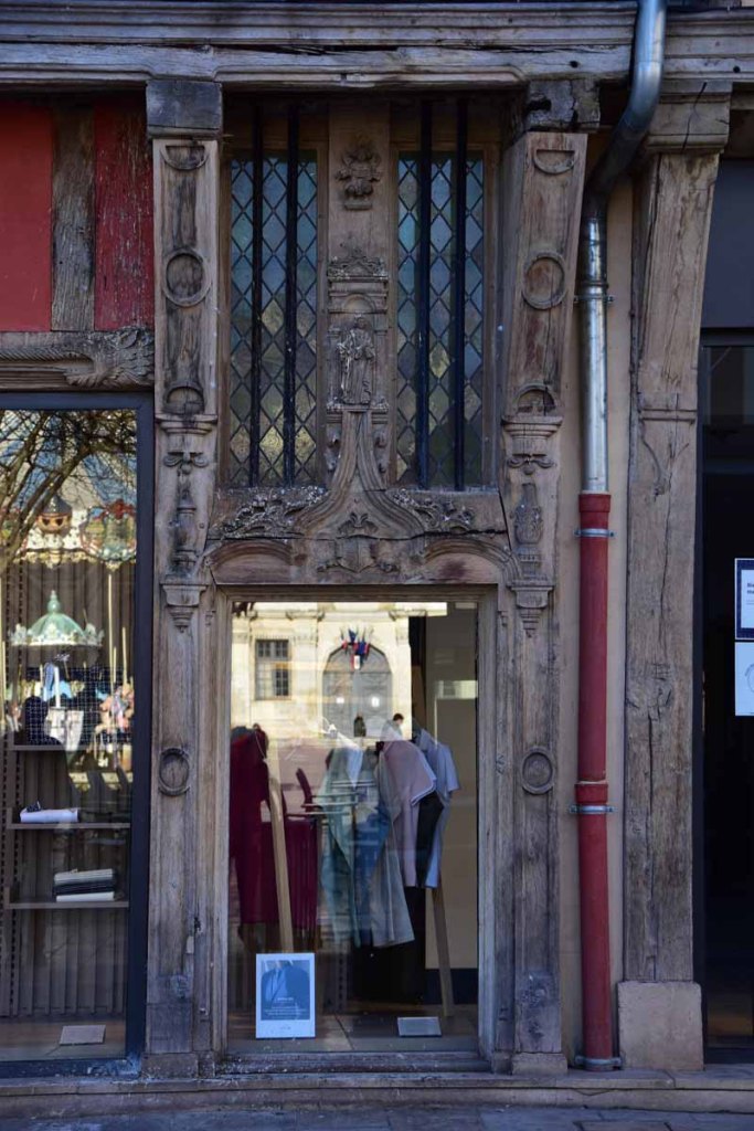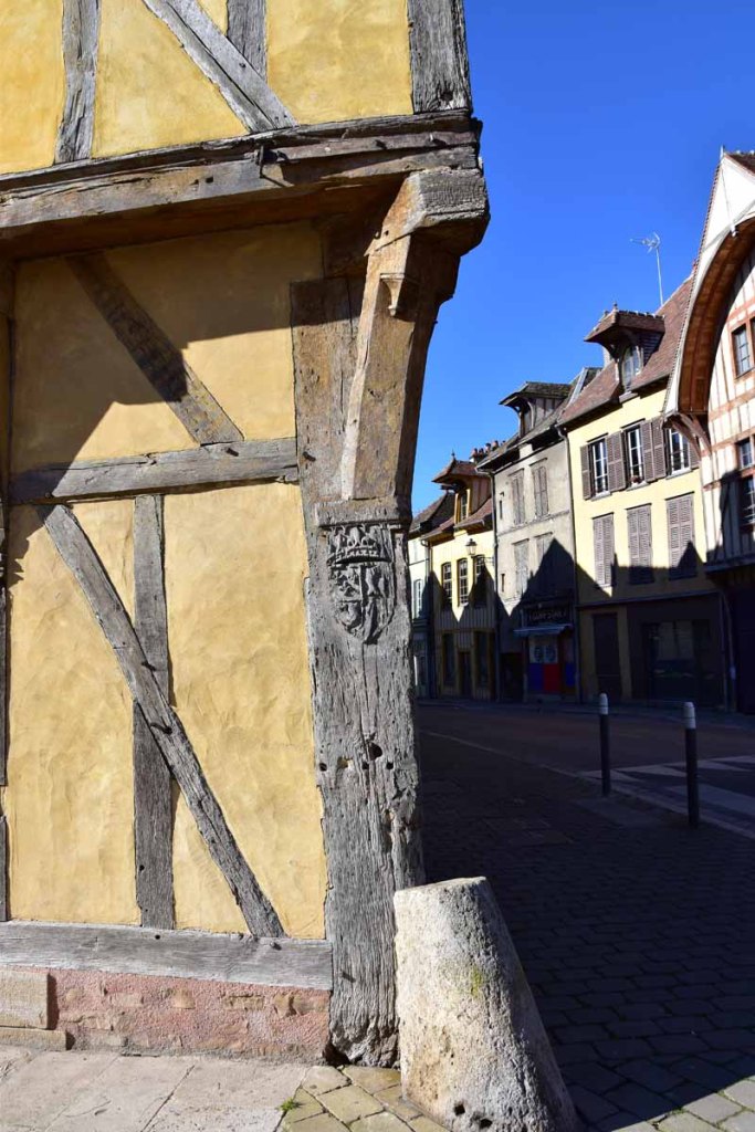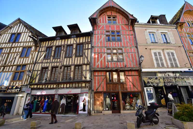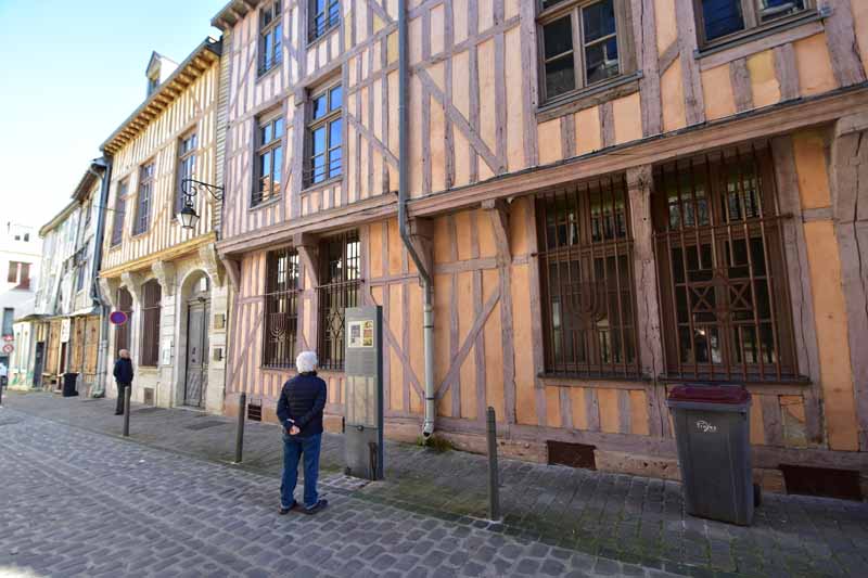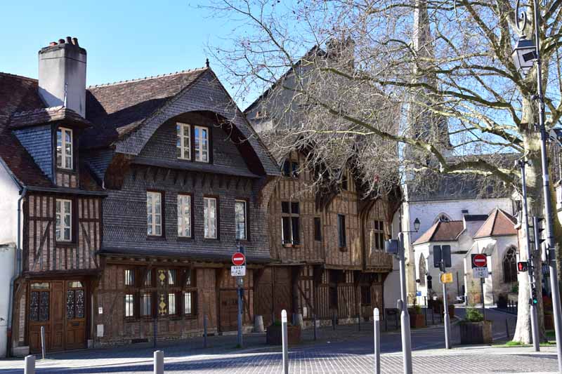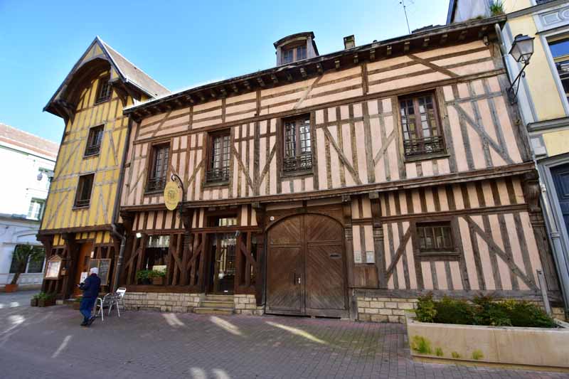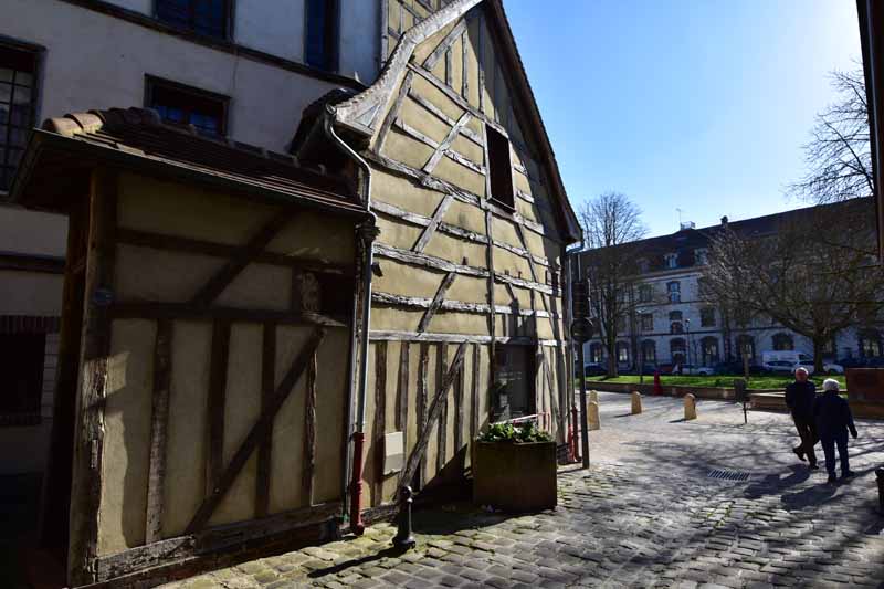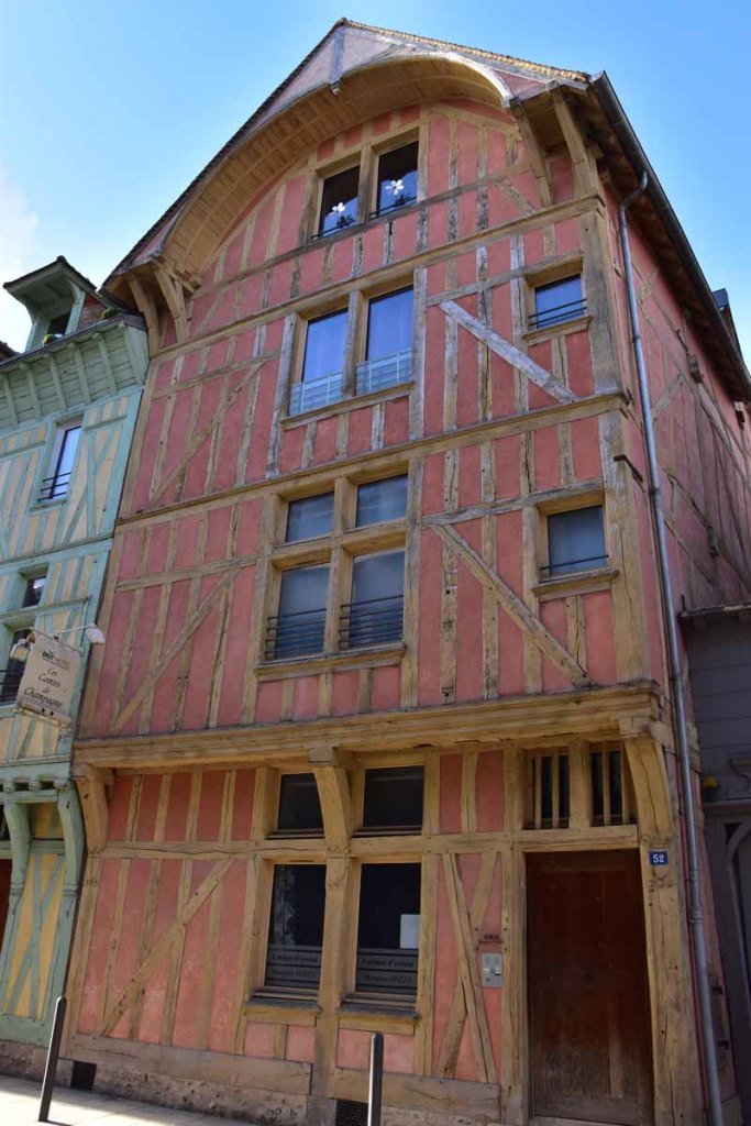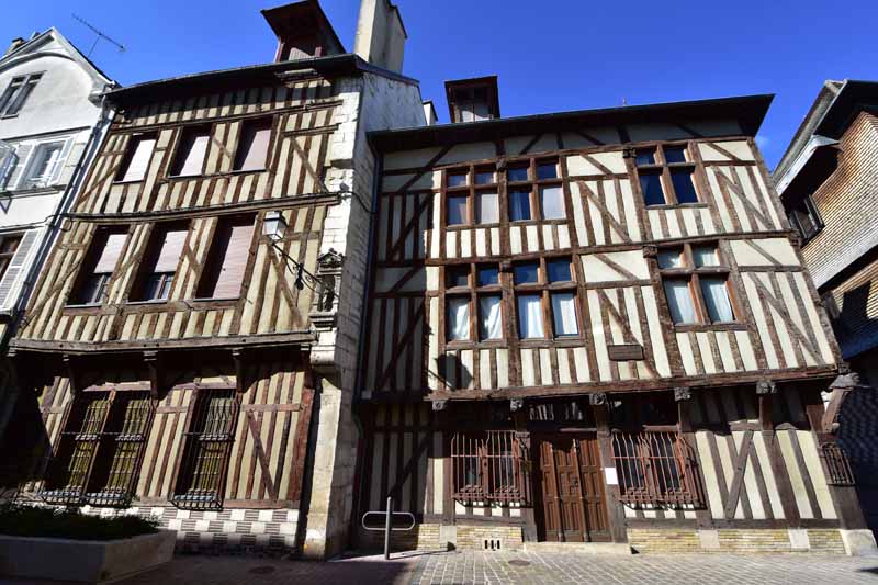 Troyes est la capitale historique de la Champagne et, bizarrement, à y regarder de plus près, on observe que le tracé du contour de la vieille ville a la forme d’un bouchon de champagne… ça ne s’invente pas ! C’est au cœur du 16ème siècle que nous sommes transportés : les ruelles pavées cheminent au milieu d’un vaste centre piéton, très homogène, entre les maisons à pans de bois (le plus grand ensemble qui subsiste de nos jours en France) superbement rénovées et les monuments religieux (cathédrale, basilique et églises) avec leurs magnifiques vitraux qui font que de nombreux spécialistes ont baptisé Troyes « Ville Sainte du Vitrail ». Un musée du vitrail existe d’ailleurs, que nous voulions aller visiter, mais hélas il était fermé… La ville s’est développée grâce au dynamisme commercial datant des foires médiévales (les fameuses foires de Champagne), au rayonnement artistique et culturel de l’école champenoise de sculpture du 16ème siècle et, enfin, au savoir-faire industriel. Troyes s’est érigée en capitale de la bonneterie dès le 19ème siècle, je me souviens maman travaillant, entre autre, pour Valton (qui n’est autre que la marque Petit-Bateau). Tout le monde avait du travail à l’époque, ce qui n’a pas été la même chose quand nous sommes arrivés en Bretagne !