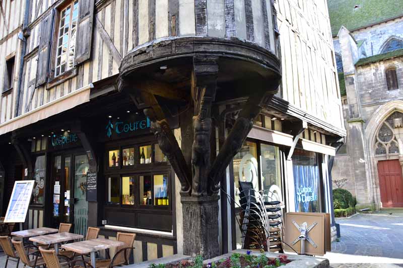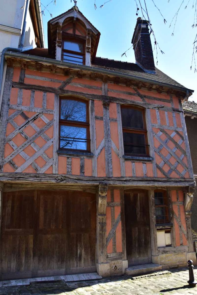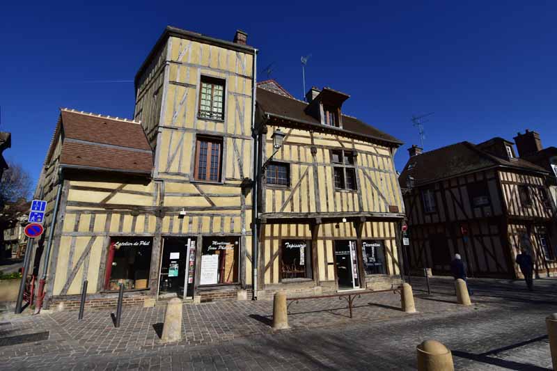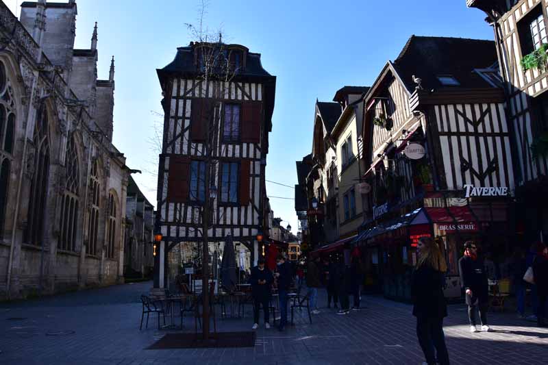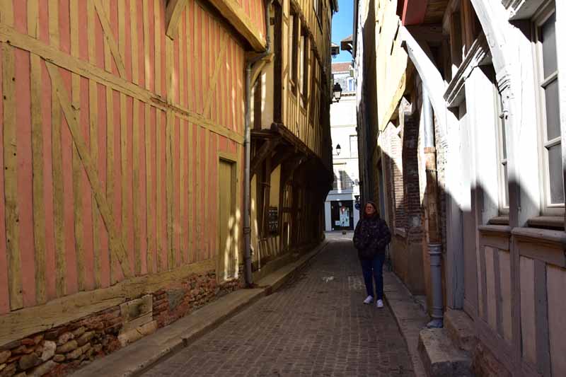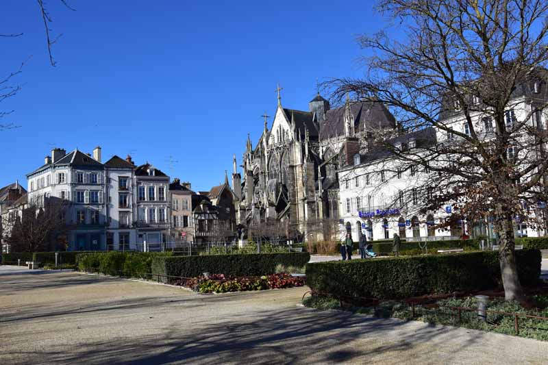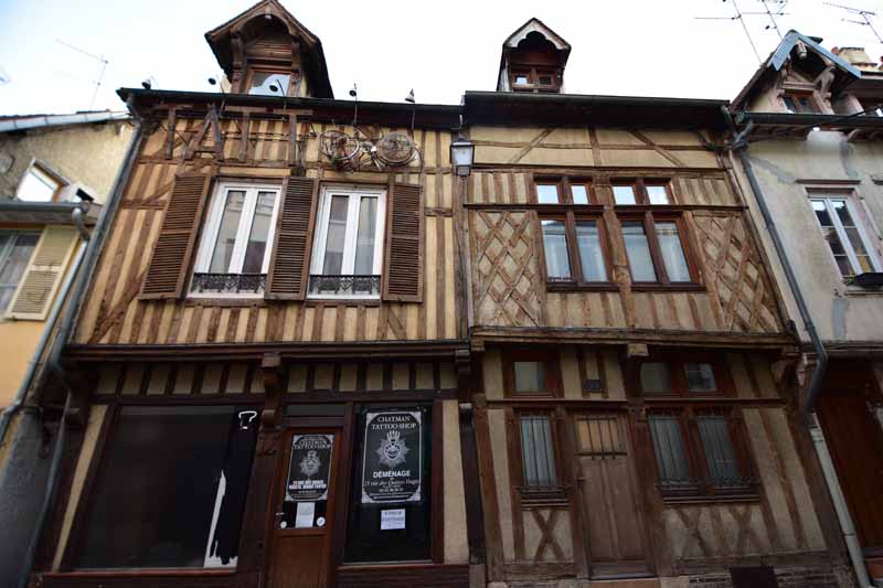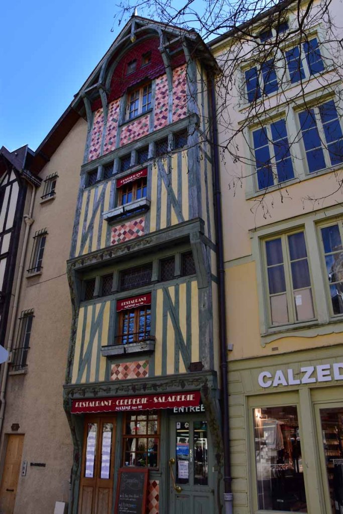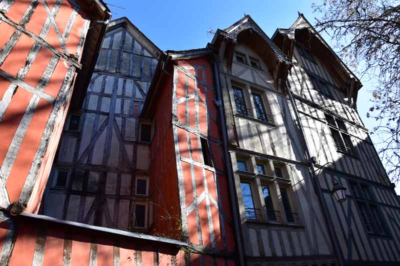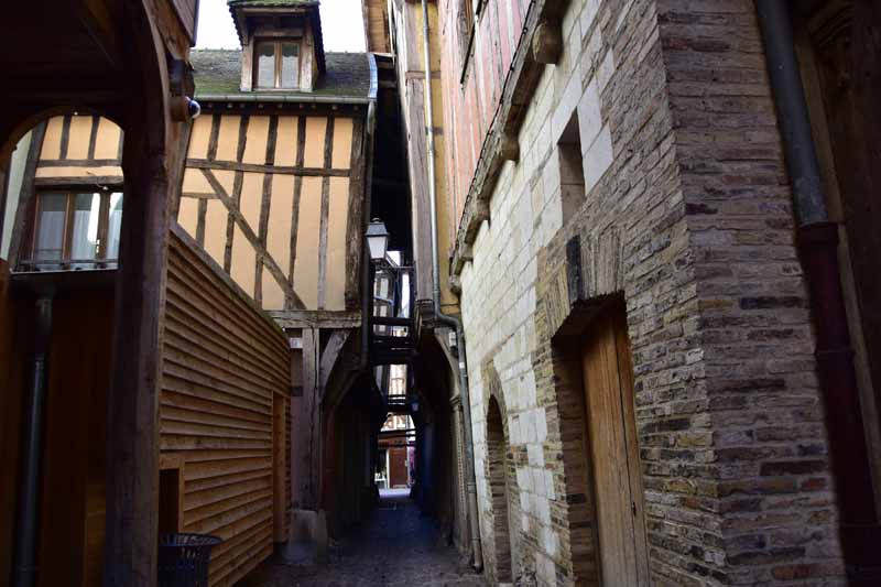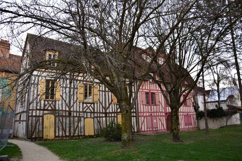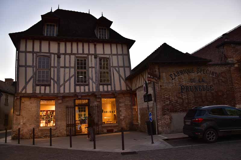 Troyes est la capitale historique de la Champagne et, bizarrement, à y regarder de plus près, on observe que le tracé du contour de la vieille ville a la forme d’un bouchon de champagne… ça ne s’invente pas ! C’est au cœur du 16ème siècle que nous sommes transportés : les ruelles pavées cheminent au milieu d’un vaste centre piéton, très homogène, entre les maisons à pans de bois (le plus grand ensemble qui subsiste de nos jours en France) superbement rénovées et les monuments religieux (cathédrale, basilique et églises) avec leurs magnifiques vitraux qui font que de nombreux spécialistes ont baptisé Troyes « Ville Sainte du Vitrail ». Un musée du vitrail existe d’ailleurs, que nous voulions aller visiter, mais hélas il était fermé… La ville s’est développée grâce au dynamisme commercial datant des foires médiévales (les fameuses foires de Champagne), au rayonnement artistique et culturel de l’école champenoise de sculpture du 16ème siècle et, enfin, au savoir-faire industriel. Troyes s’est érigée en capitale de la bonneterie dès le 19ème siècle, je me souviens maman travaillant, entre autre, pour Valton (qui n’est autre que la marque Petit-Bateau). Tout le monde avait du travail à l’époque, ce qui n’a pas été la même chose quand nous sommes arrivés en Bretagne !