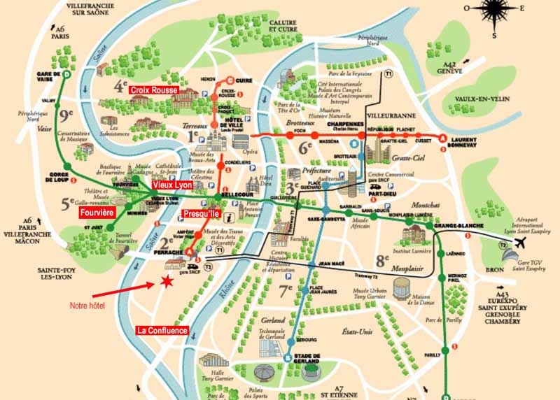 Allez, assez discuté, c’est parti pour la visite du quartier de la Confluence, le plus près de « chez nous »… Mais pour mieux vous situer, voilà une petite carte avec les quartiers que nous avons visités.