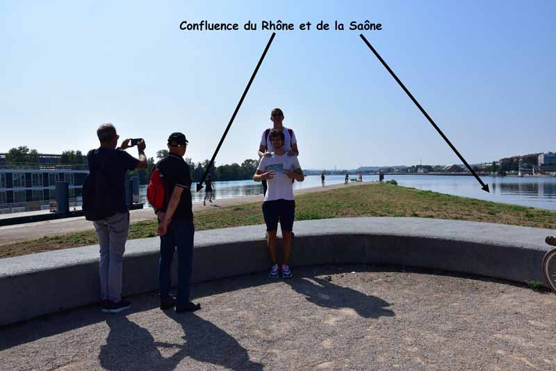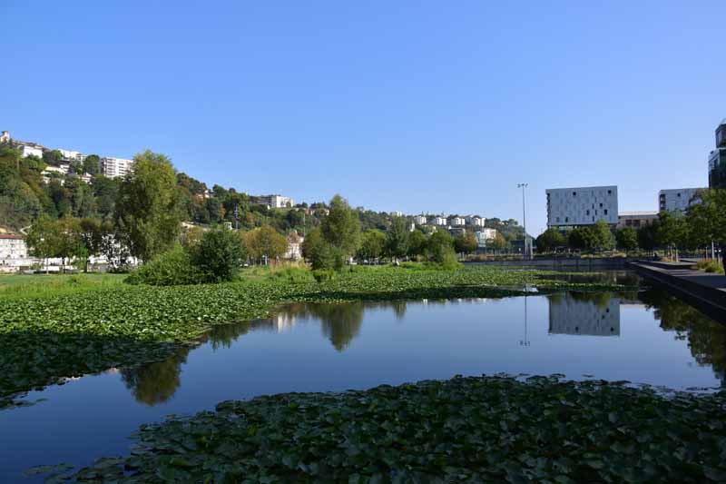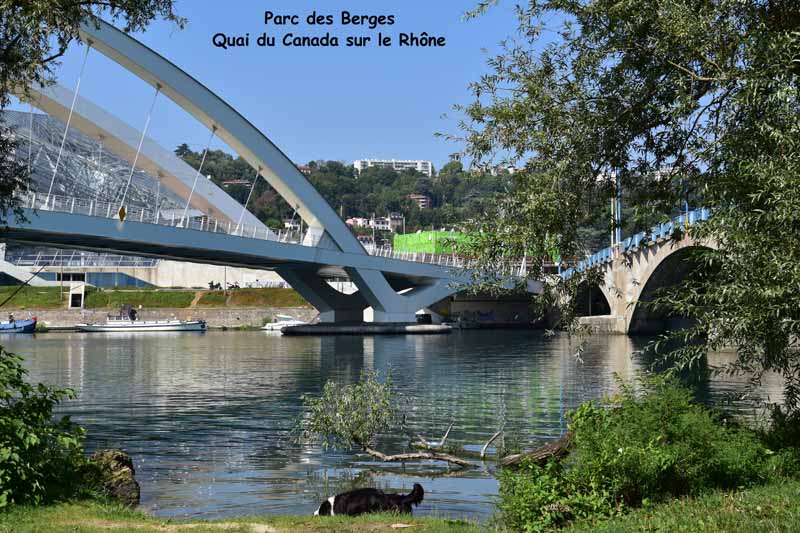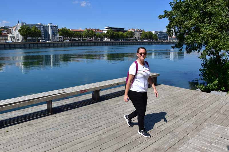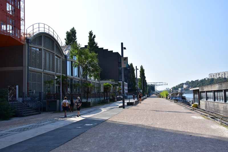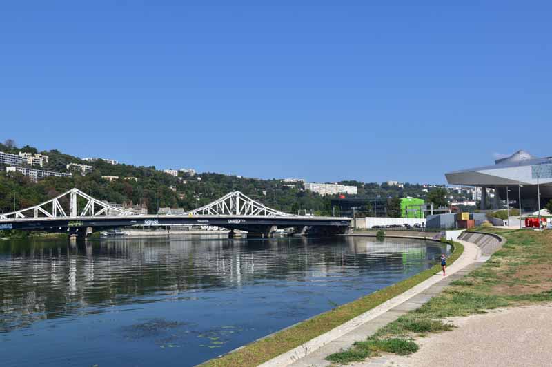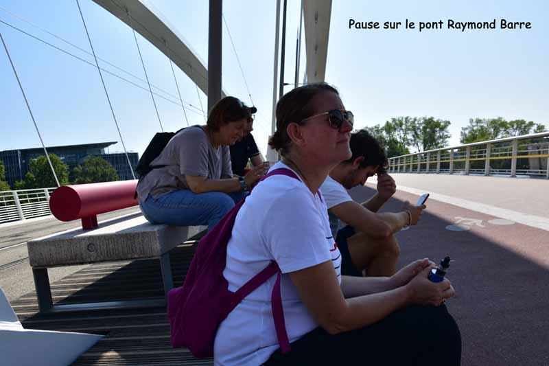 Nous avons ensuite traversé le pont Raymond Barre qui enjambe le Rhône (sur lequel nous avons fait une petite pause car la chaleur était vraiment intense), ce qui nous a permis de rejoindre le quartier de Gerland. Mathieu aurait aimé nous entraîner jusqu’au stade du même nom mais nous n’avons pas cédé car nous avions déjà bien marché et nous n’étions qu’à la moitié de notre parcours ! Le quai qui longe le Rhône est moins urbanisé et beaucoup plus vert que le côté Saône.