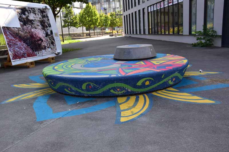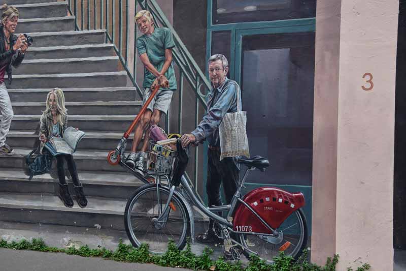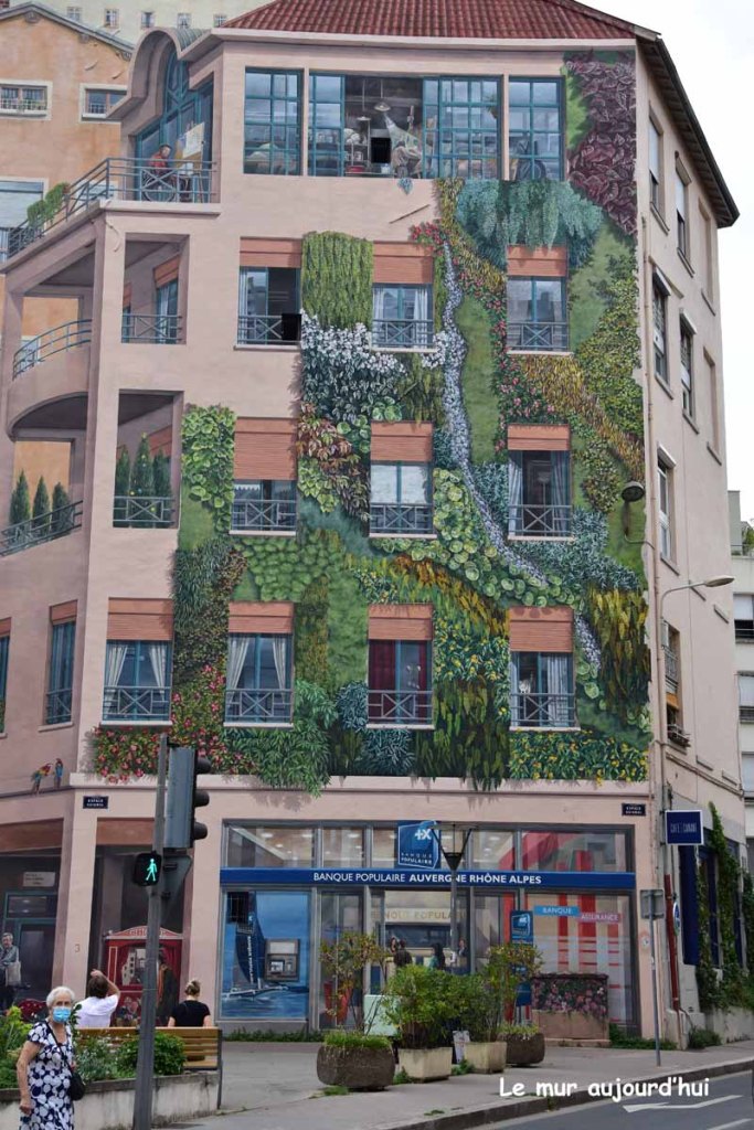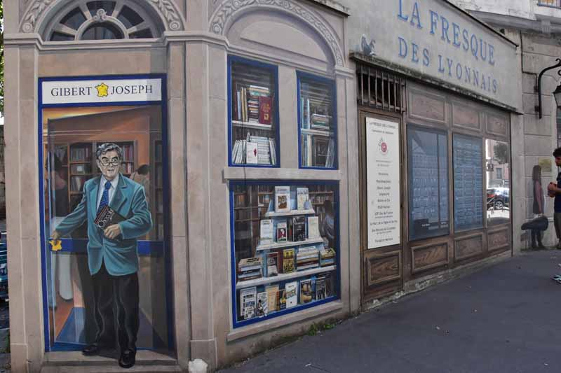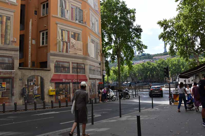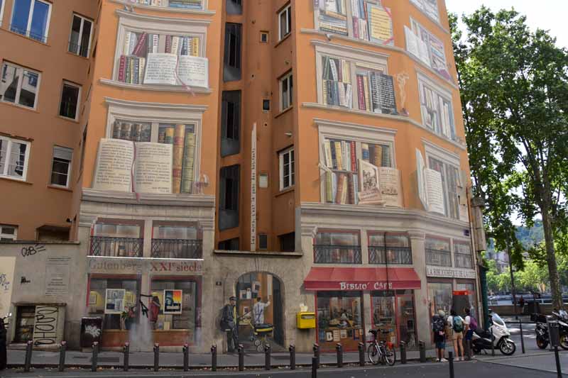 Plus loin, « la fresque de la bibliothèque de la cité », mur peint sur 400 m² représente une immense bibliothèque recensant plusieurs centaines d’écrivains de genres différents de Lyon et de Rhône-Alpes. Pour nous qui sommes adeptes des « murales », nous avons été gâtés !