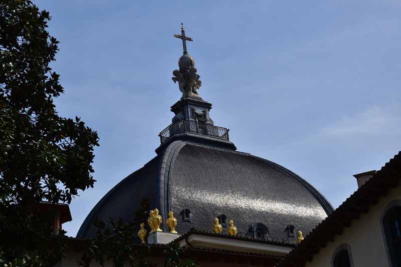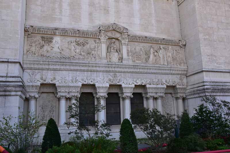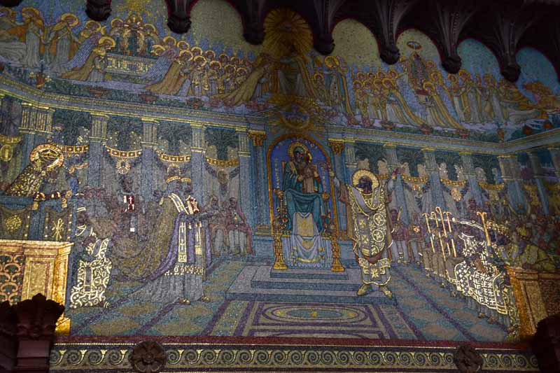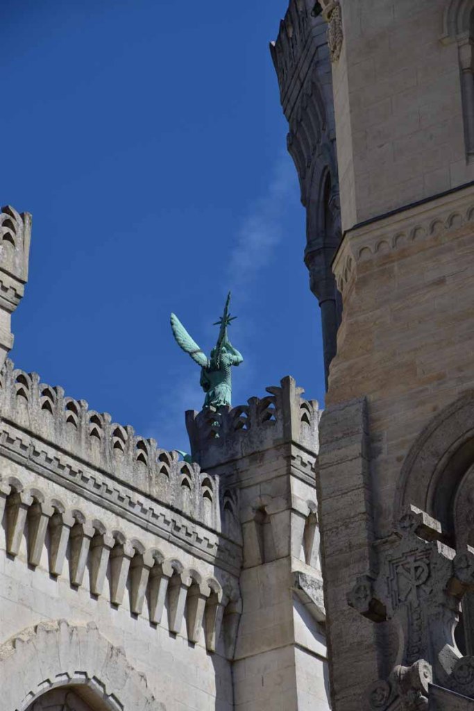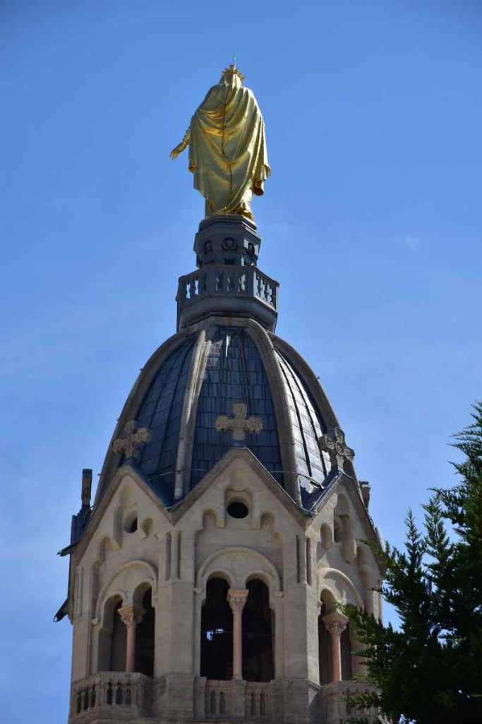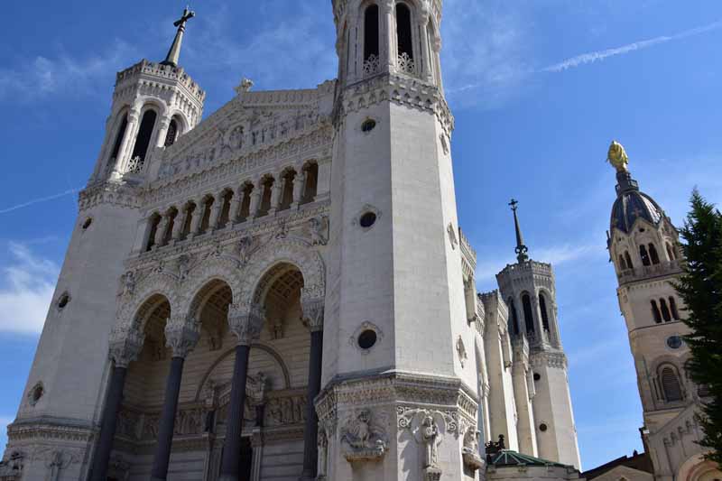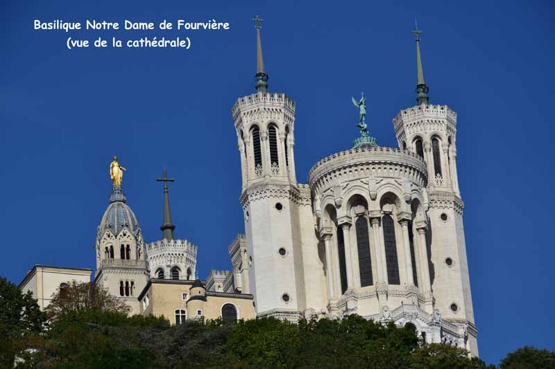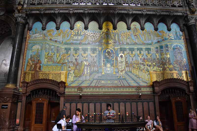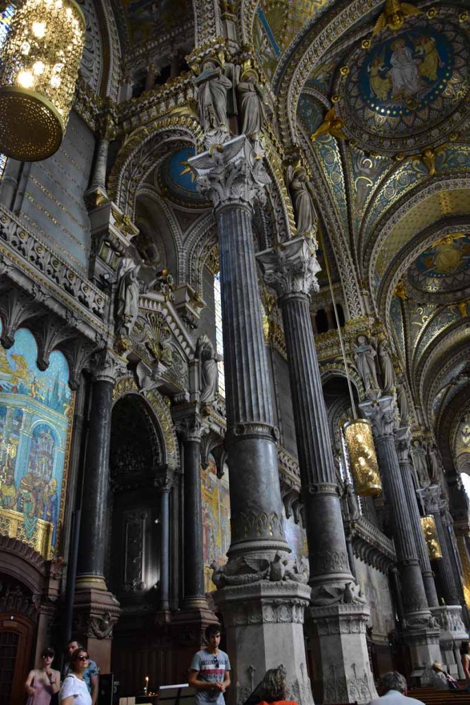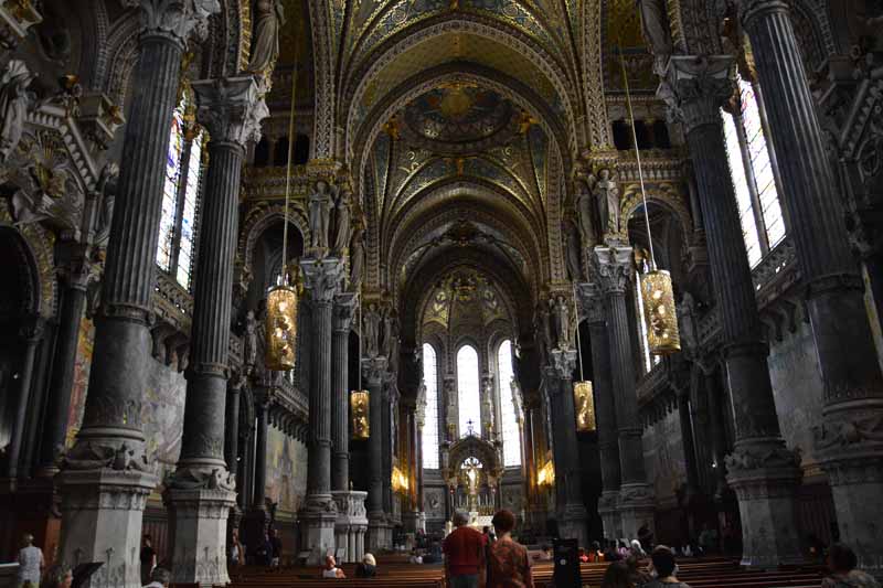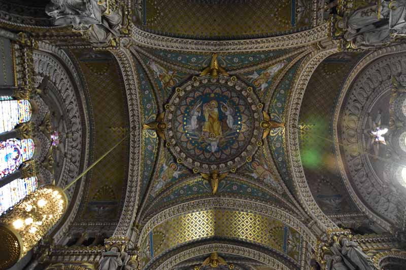 La basilique a été élevée après la guerre de 1870, l’archevêque de Lyon s’étant engagé à construire une église si l’ennemi n’approchait pas de la ville. L’édifice a été consacré en 1896. Autant sa silhouette est massive, autant le décor intérieur est exubérant avec ses mosaïques, ses ors, ses bois sculptés… Contempler toutes ces merveilles nous a permis de nous reposer un peu !