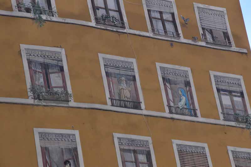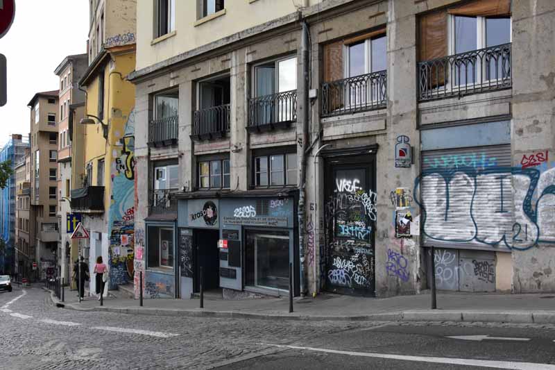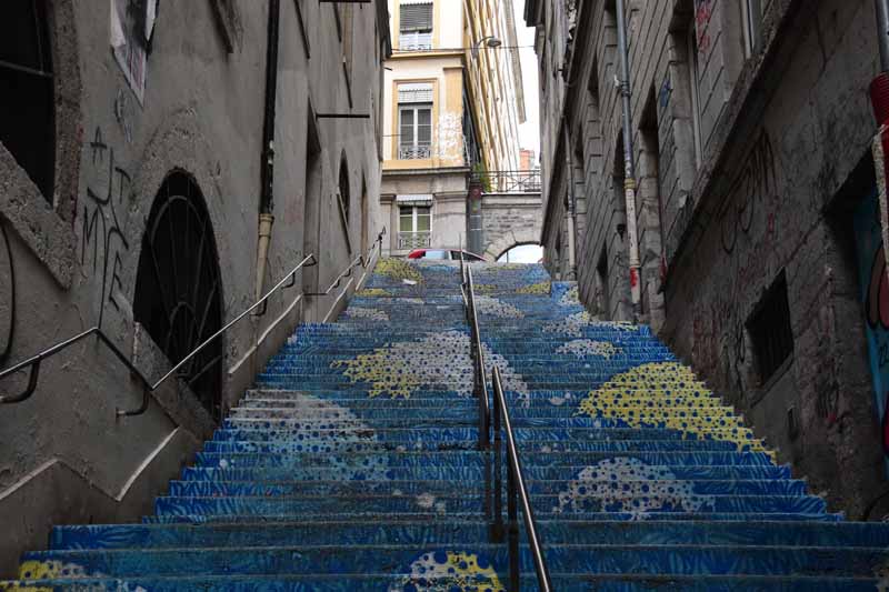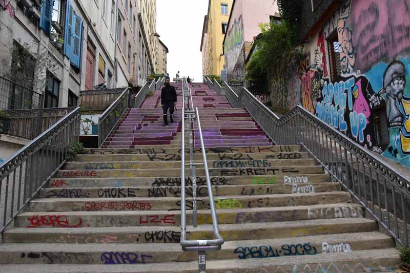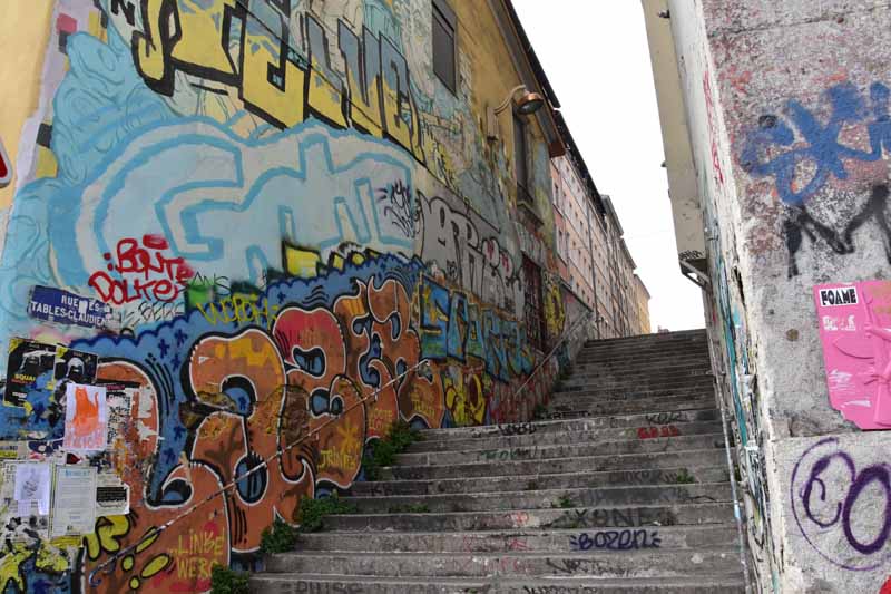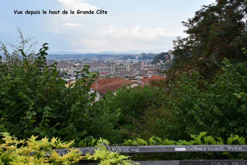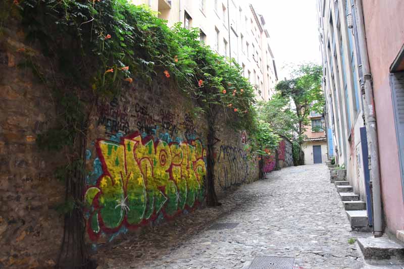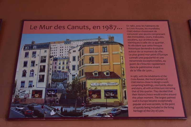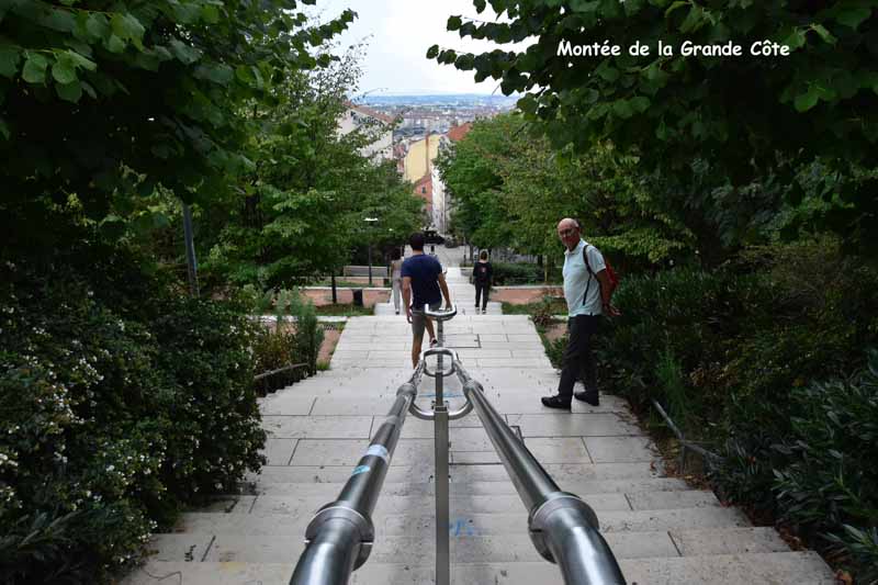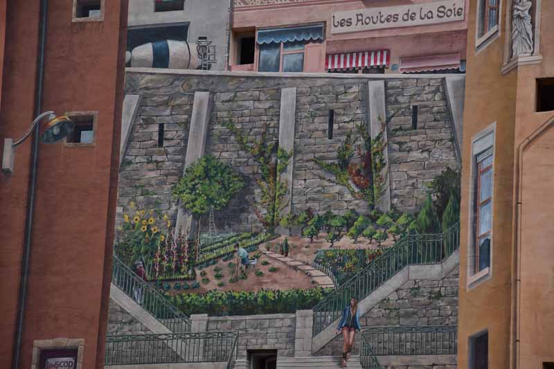 Pour ce dernier jour, il nous restait encore un quartier important à visiter, le quartier de la Croix Rousse. Perché sur la colline qui lui a donné son nom, c’est là qu’œuvraient les fameux canuts. Nous avons repéré sur le plan « le mur des canuts », magnifique fresque évolutive qui couvre 1200 m², et nous avons décidé de commencer par là. Situé tout au Nord du quartier, nous avons pris le métro pour nous y rendre sachant que nous serions ainsi au plus haut et qu’il nous suffirait de redescendre pour visiter le reste de ce quartier… Bien nous en a pris car nous nous sommes aperçus qu’il valait mieux descendre la « Montée de la Grande Côte » que la monter !!!