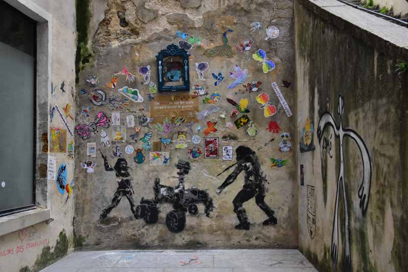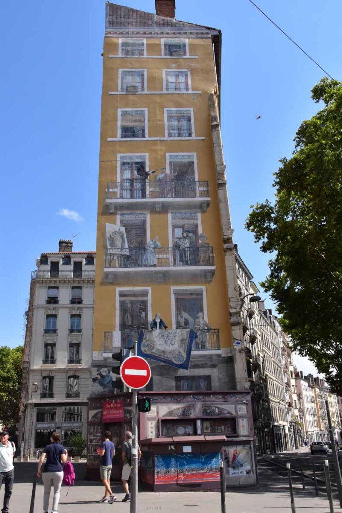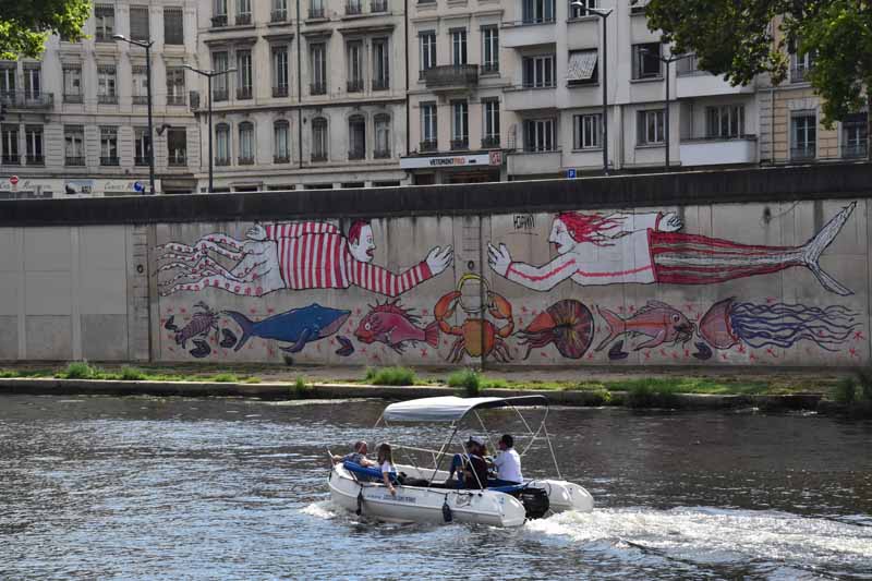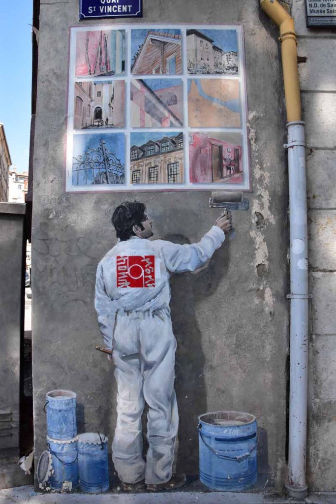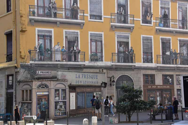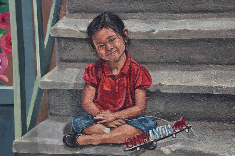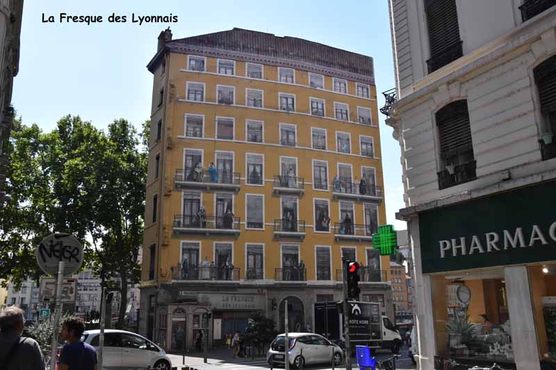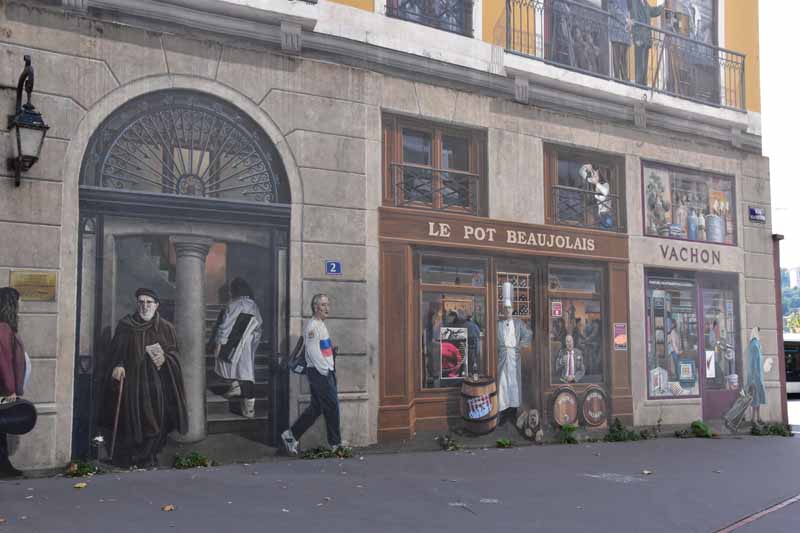 Regonflés par cette halte, nous sommes repartis à la recherche des autres « murales » célèbres de la ville, à commencer par la « fresque des lyonnais ». Réalisée en 1995 par CitéCréation (à qui l’on doit aussi « le mur des canuts », pas moins de 31 personnages de la région y sont représentés parmi lesquels Bernard Pivot, l’abbé Pierre, Paul Bocuse…