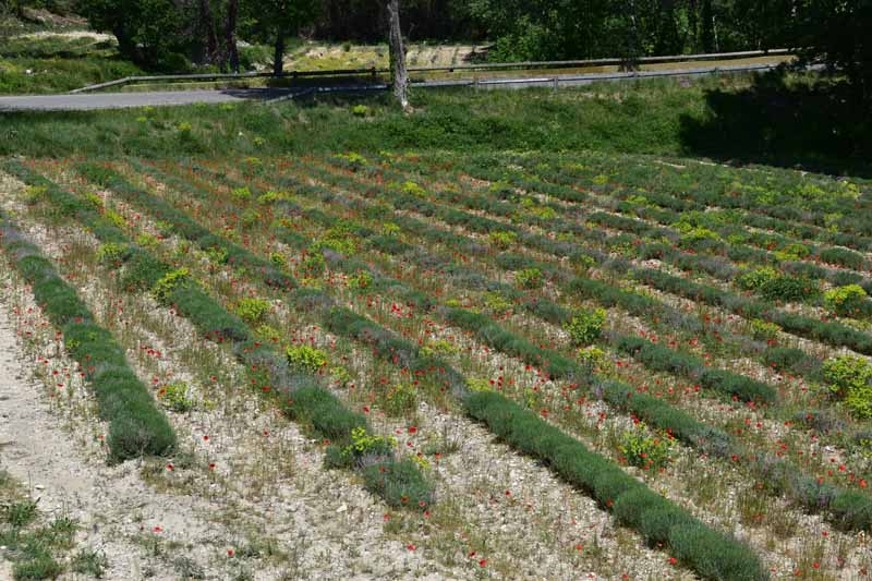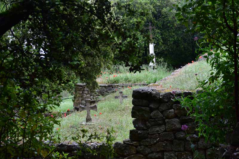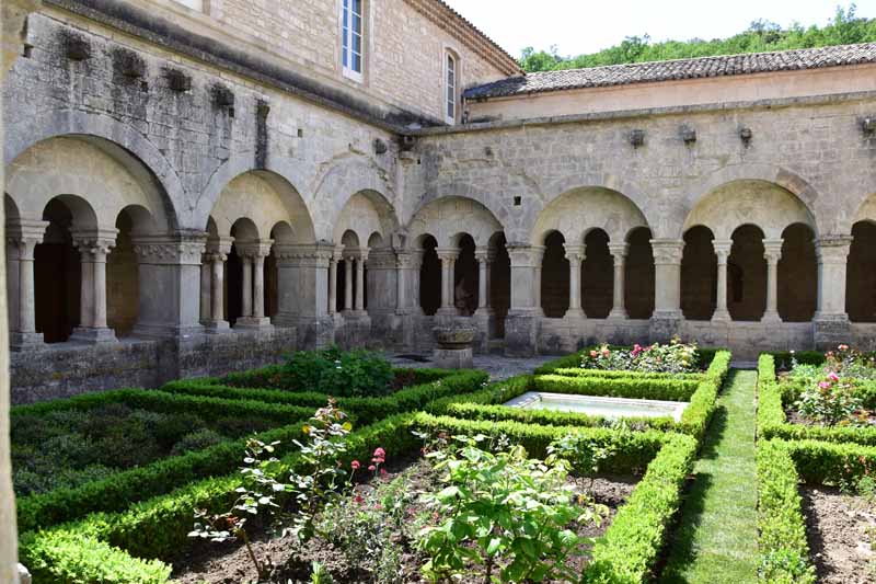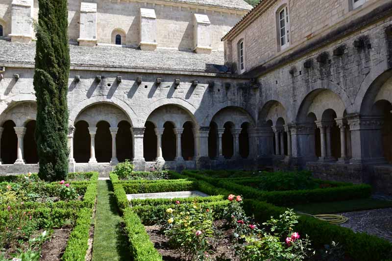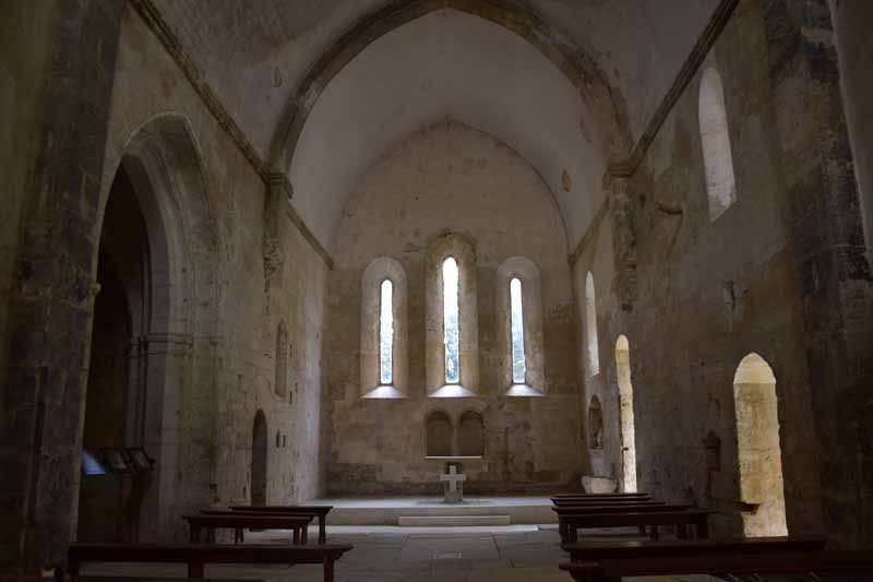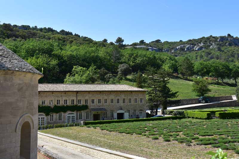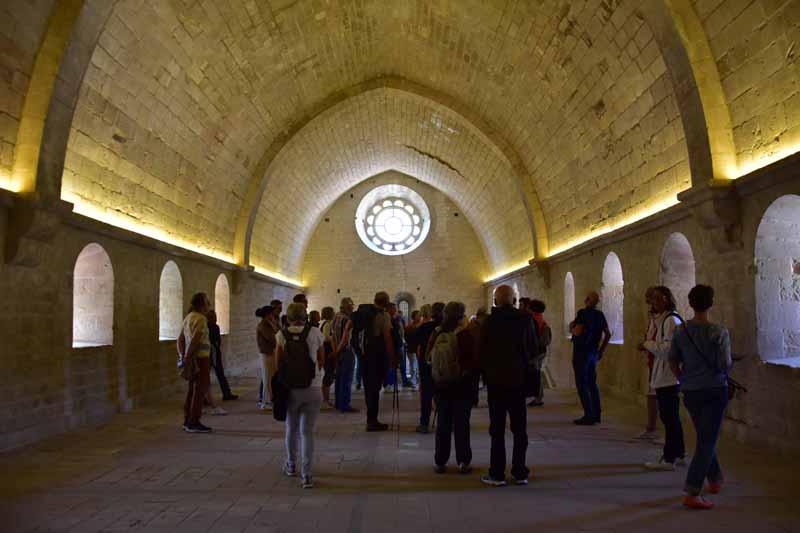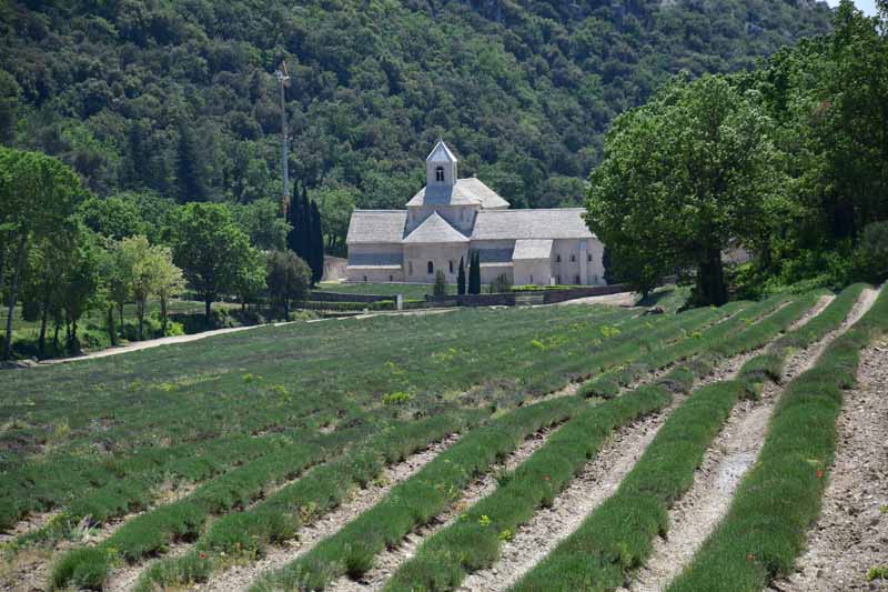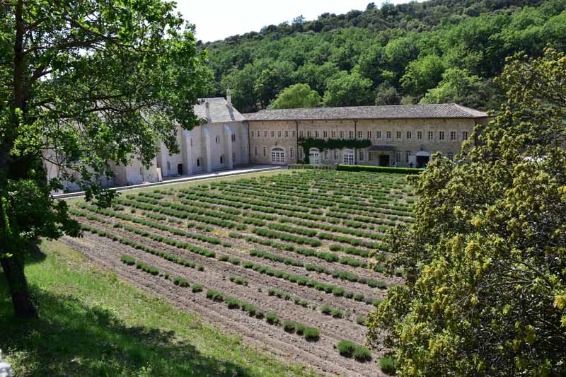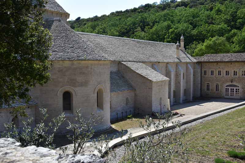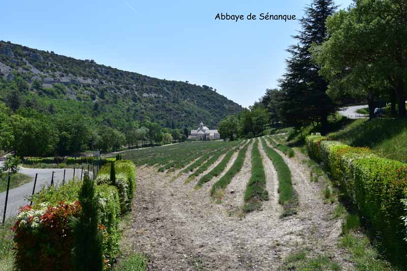 Nous avons continué notre route jusqu’à l’Abbaye cistercienne de Sénanque, incontournable dans la région. Nous sommes arrivés à point nommé pour la visite guidée de 14h30, on ne pouvait pas mieux faire. Nous avons eu la chance d’avoir un guide très intéressant qui nous a appris, entre autres choses, qu’elle avait été fondée en 1148. Six moines vivent encore dans les lieux et le silence est donc de rigueur (pas facile pour nous…) d’autant que les moines cisterciens prônent un idéal ascétique suivant la règle de St Benoît : isolement, pauvreté et humilité (tout ce qui nous fait rêver !!!). Bien sûr, il nous a appris beaucoup de petites anecdotes que je ne vais pas vous relater ce soir. L’abbaye est très réputée également pour ses champs de lavande qui, hélas, vous l’aurez compris en regardant les photos, ne sont pas en fleurs en ce moment !!!