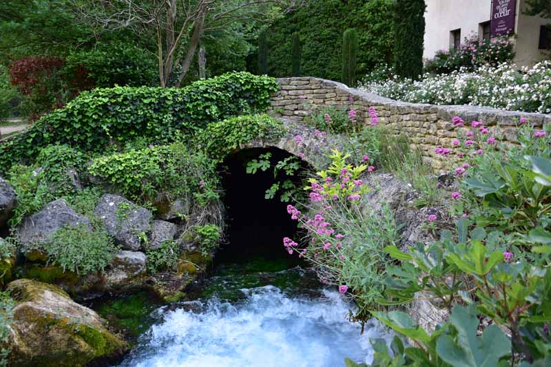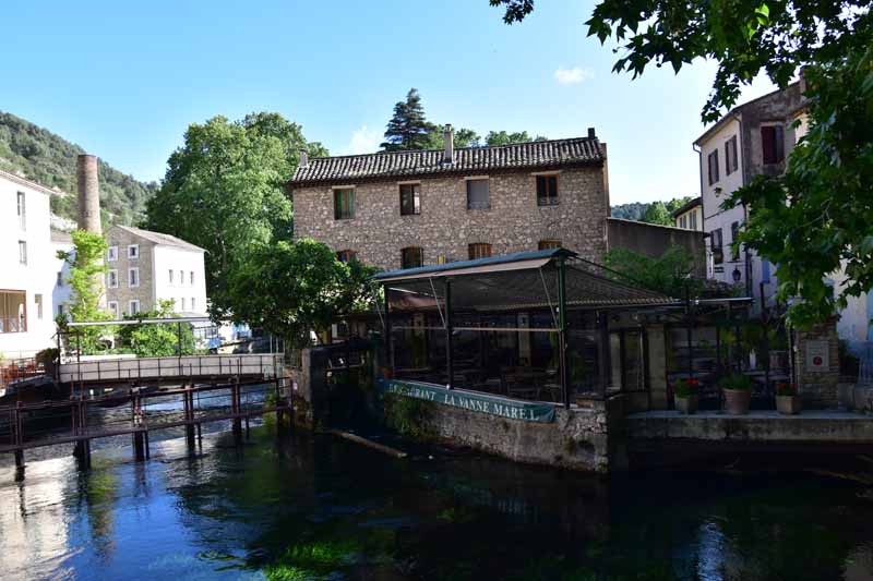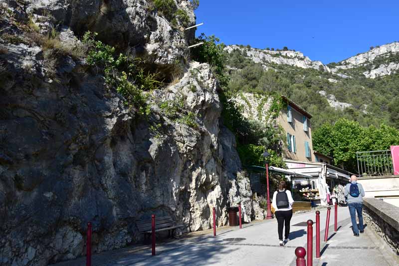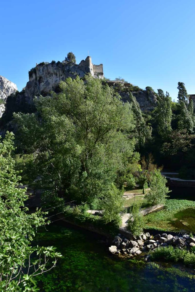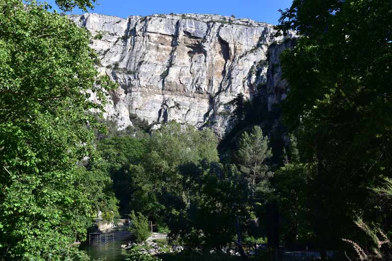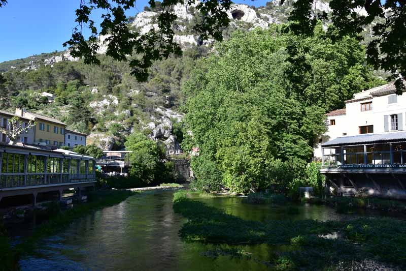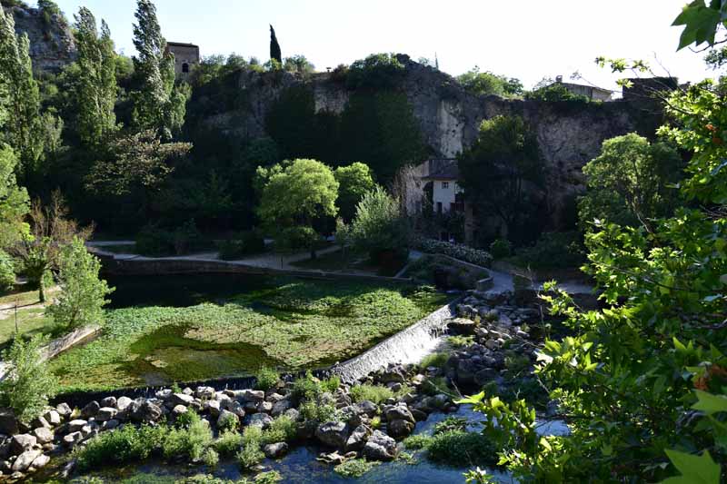Nous avons flâné dans les rues du village situé au fond d’un cirque rocheux aux parois impressionnantes. Nous nous sommes arrêtés au moulin à papier (dont nous avions encore un souvenir assez vivant après plus de 40 ans !). Puis nous sommes partis jusqu’à la résurgence de la Sorgue dont on ne connaît toujours pas aujourd’hui la provenance. En fait, il faut y venir quand les eaux sont très hautes et que la Sorgue d’un profond vert émeraude se déverse du gouffre, ce qui n’était pas le cas aujourd’hui ! Mais peu importe, la balade était vraiment sympa…