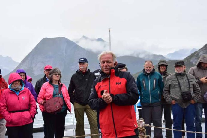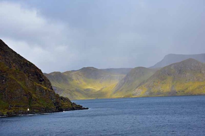 Entre temps, la mer était toujours agitée mais le temps pas si mauvais, pas de brume et pas de pluie… Cela nous a permis de voir de belles choses et donc, de faire de belles prises de vue. Quand un rayon de soleil éclaire les montagnes, c’est tout simplement superbe. Si nous n’avons pas vu d’aurores boréales, nous avons vu beaucoup d’arcs en ciel ce qui n’est pas déplaisant non plus ! Nous avons aussi la chance de voir plusieurs troupeaux de rennes, hélas, je n’avais pas le bon objectif mais vous pourrez quand même avoir un aperçu. Aux jumelles, on les voyait très bien.